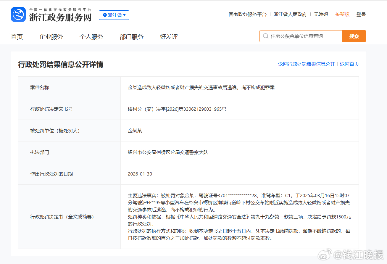 #金晨被罚1500元# 2月7日,据浙江政务服务网行政处罚结果信息公开详细页显示《金某造成致人轻微伤或者财产损失的交通事故后逃逸,尚不构成犯罪案》:演员因交通肇事逃逸被罚款1500元。
