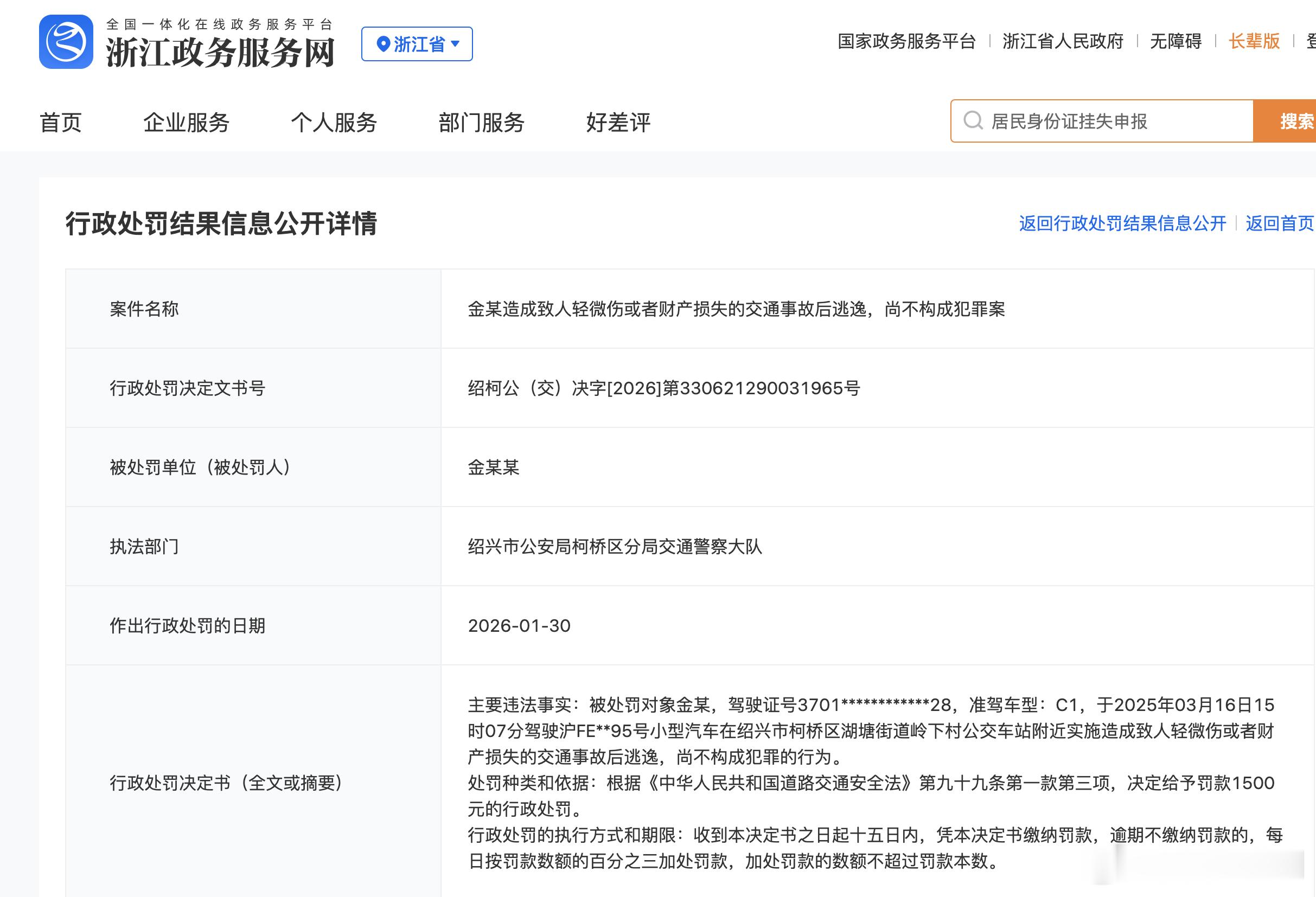 金晨交通事故不构成犯罪【演员金晨交通事故处罚结果公开:罚款1500元,金某造成致人轻微伤或者财产损失的交通事故后逃逸,尚不构成犯罪】金晨交通事故被罚款1500元浙江政务服务网公布肇事逃逸事件处理结果:被处罚对象金某,驾驶证号3701************28,准驾车型:C1,于2025年03月16日15时07分驾驶沪FE**95号小型汽车在绍兴市柯桥区湖塘街道岭下村公交车站附近实施造成致人轻微伤或者财产损失的交通事故后逃逸,尚不构成犯罪的行为。处罚种类和依据:根据《中华人民共和国道路交通安全法》第九十九条第一款第三项,决定给予罚款1500元的行政处罚。行政处罚的执行方式和期限:收到本决定书之日起十五日内,凭本决定书缴纳罚款,逾期不缴纳罚款的,每日按罚款数额的百分之三加处罚款,加处罚款的数额不超过罚款本数。