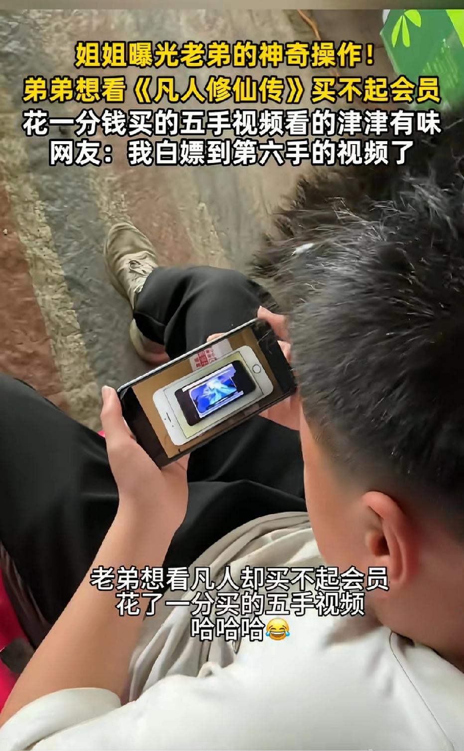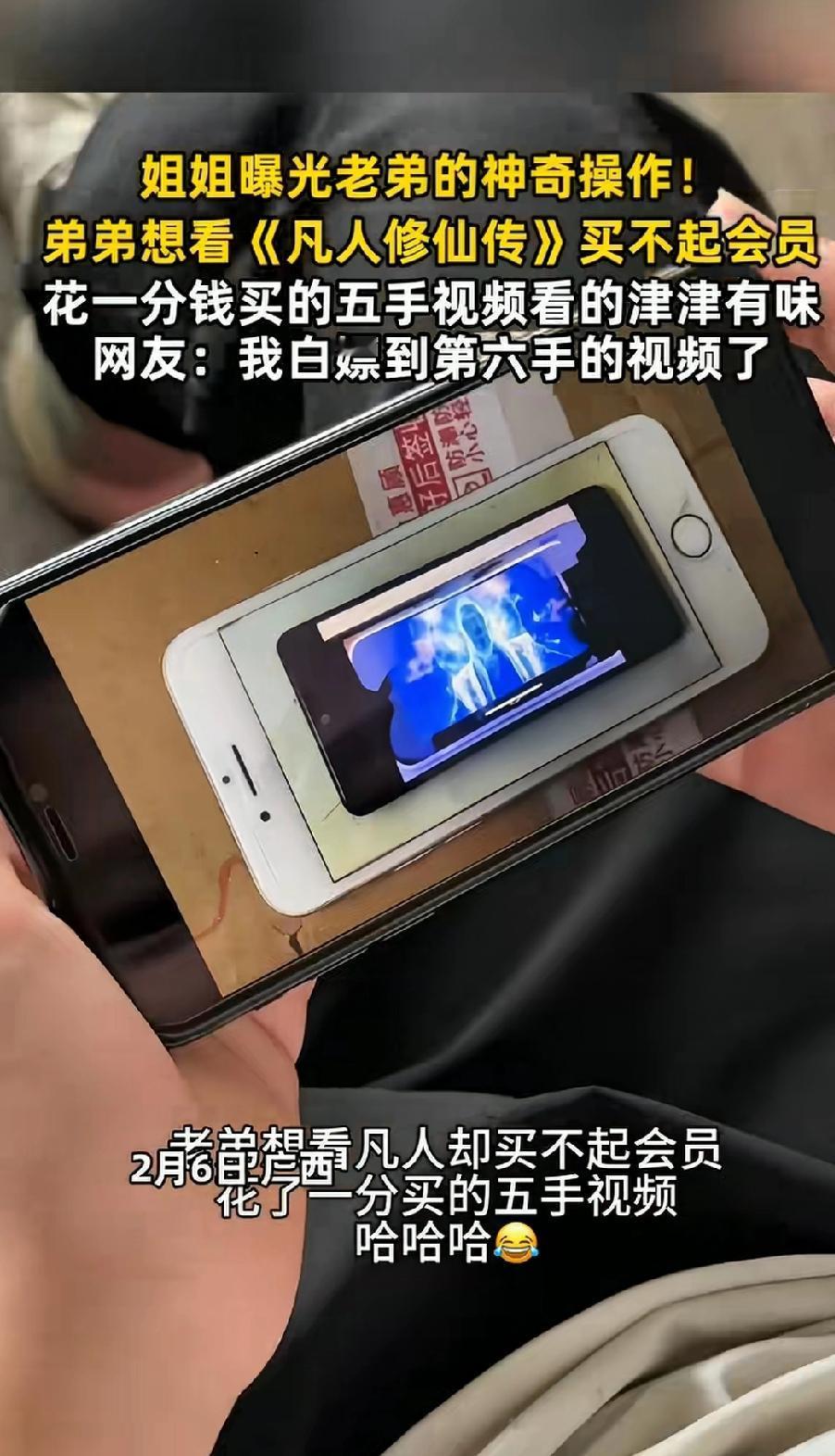 近日广西南宁,一18岁女子爆料,自己的弟弟想看电影,又没有会员看不了,谁料,他在花了1分钱后就看的津津有味了! 原来,女子的弟弟在网上支付了1分钱,买到了一个五手的视频,可以正常观看电影,他不在乎画质这些之类的,反正能看就行!虽然是通过一个又一个的手机录制出来的电影,但一点不影响人家的热情,看的十分入神! 看见这一幕,网友评论道:这下好了,你这第六手的视频被我白嫖到了,哈哈!看来还是我更会省钱过日子,一分钱没花就看到了!不过话说回来,现在各大视频网站的一些好看电影都是需要会员才能观看了,不知道从什么时候开始,这仿佛成了一种公众默认的东西了!