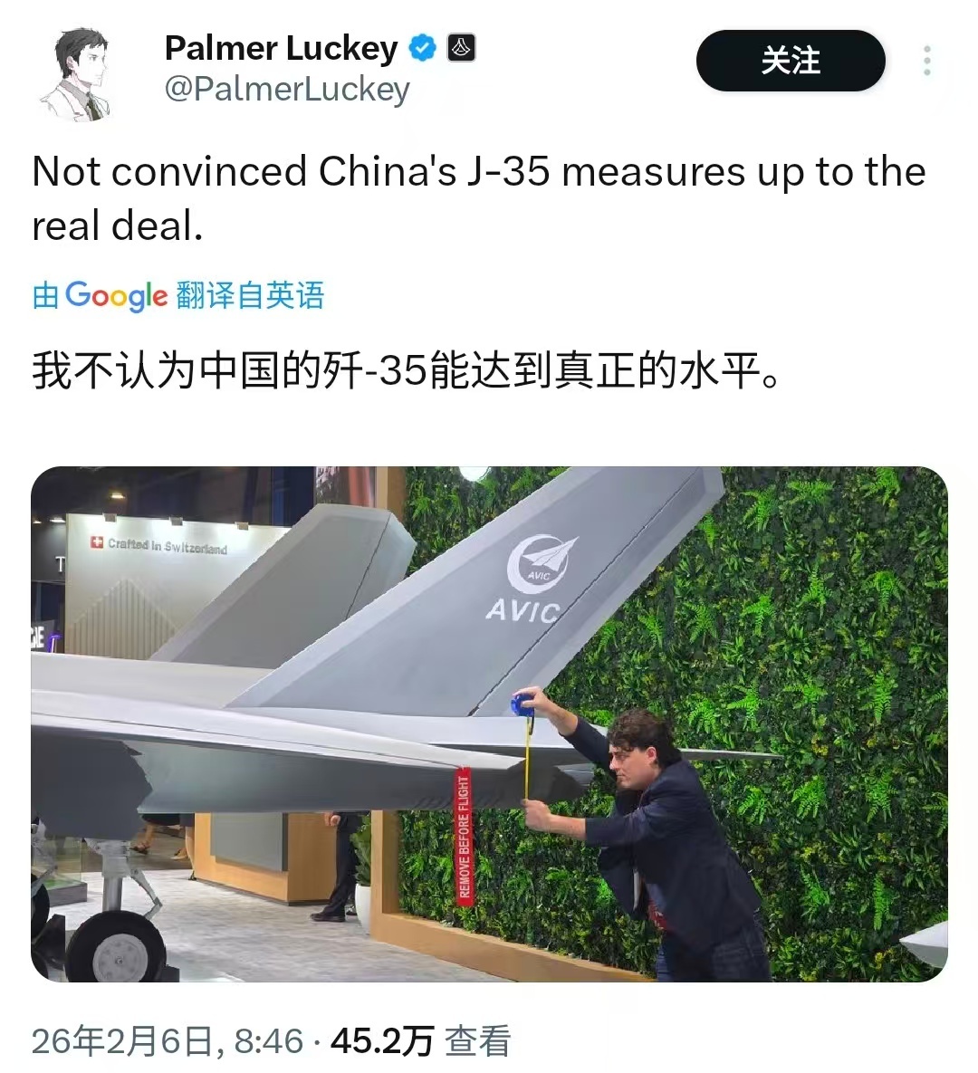新加坡航展现场,美国军工独角兽企业安杜里尔工业公司创始人兼CEO帕尔默·拉奇亲手拉卷尺测量歼-35缩比模型,并在X上称不看好歼-35。