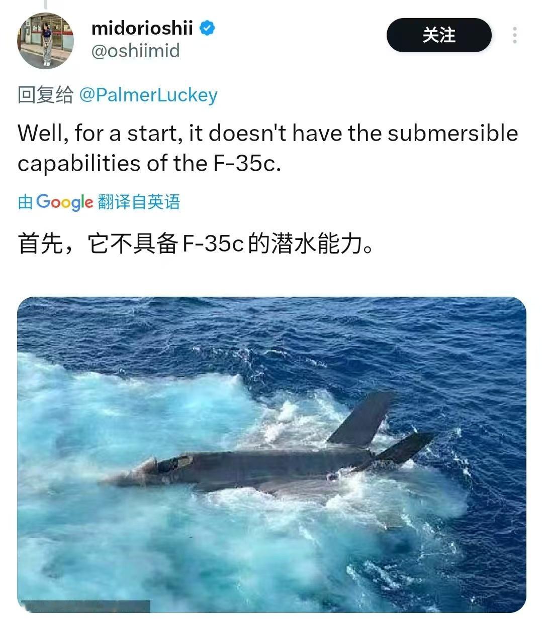 网友在他的帖子下面极尽“认同”,说歼-35的确赶不上F-35,至少不具备下海潜水和跳弹狗啃泥的能力,更不及PPT阶段的F-47。
