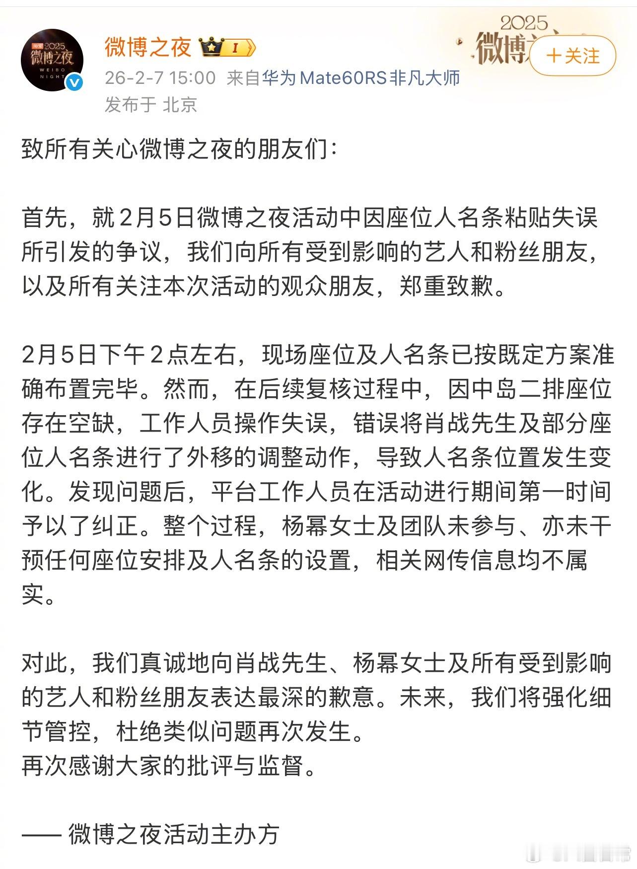 微博之夜主办方发了关于那天座位事件的说明,并向肖战、杨幂及所有受到影响的艺人和粉