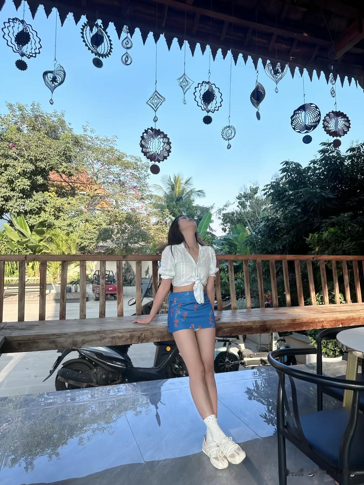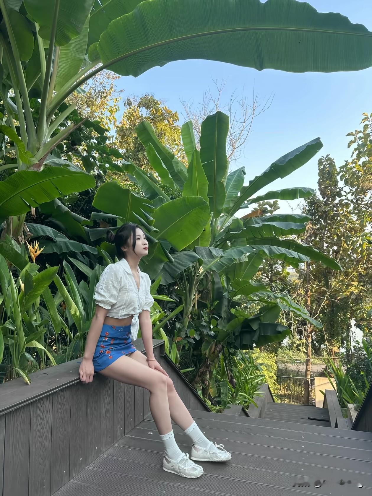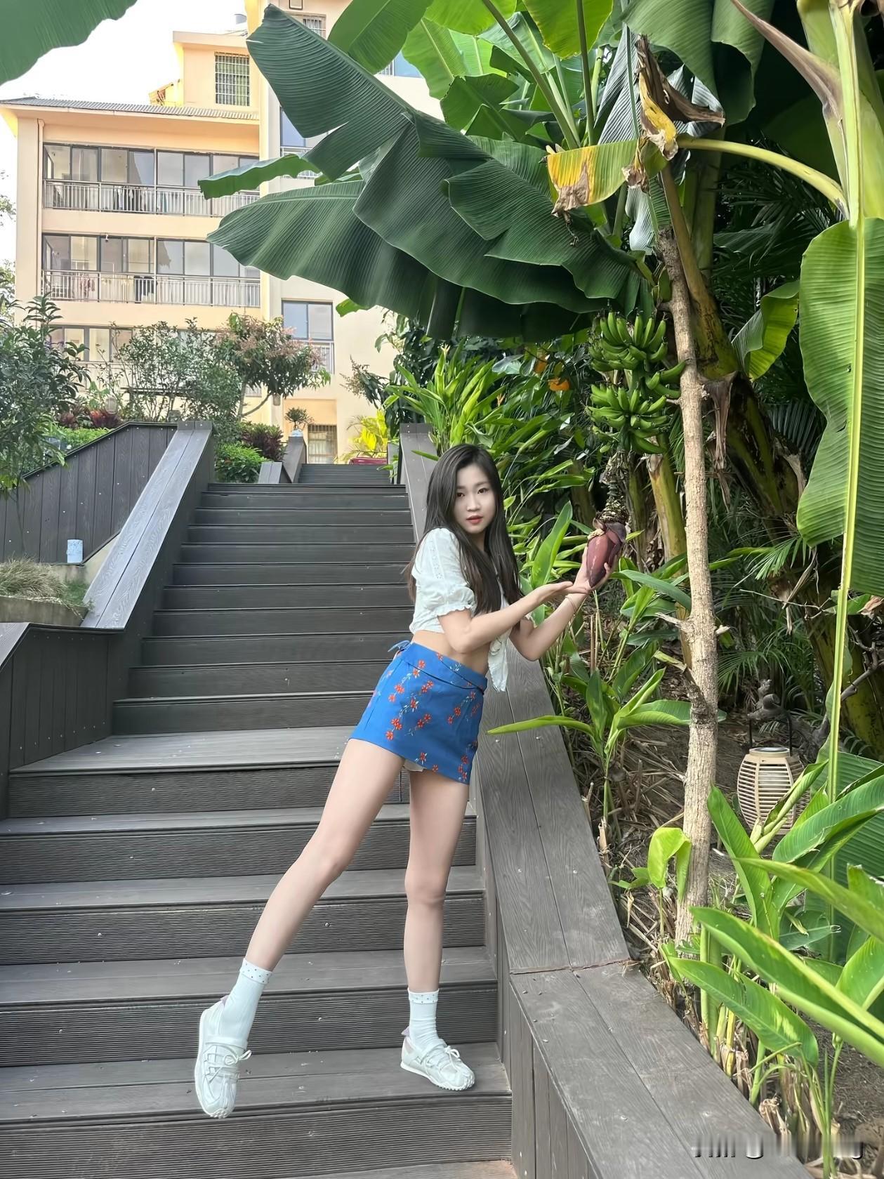 🌿在绿意盎然的芭蕉树下,邂逅一场夏日的清新与活力! 她身着白色短上衣+蓝色碎花短裙,脚踩小白鞋,站在木质阶梯上,手捧香蕉花,笑容灿烂如阳光。 背景是错落有致的居民楼与茂盛植物,仿佛置身热带庭院,治愈感满满~ 📸随手一拍都是大片,生活就该这样充满色彩与生机! 夏日穿搭 芭蕉树下的少女