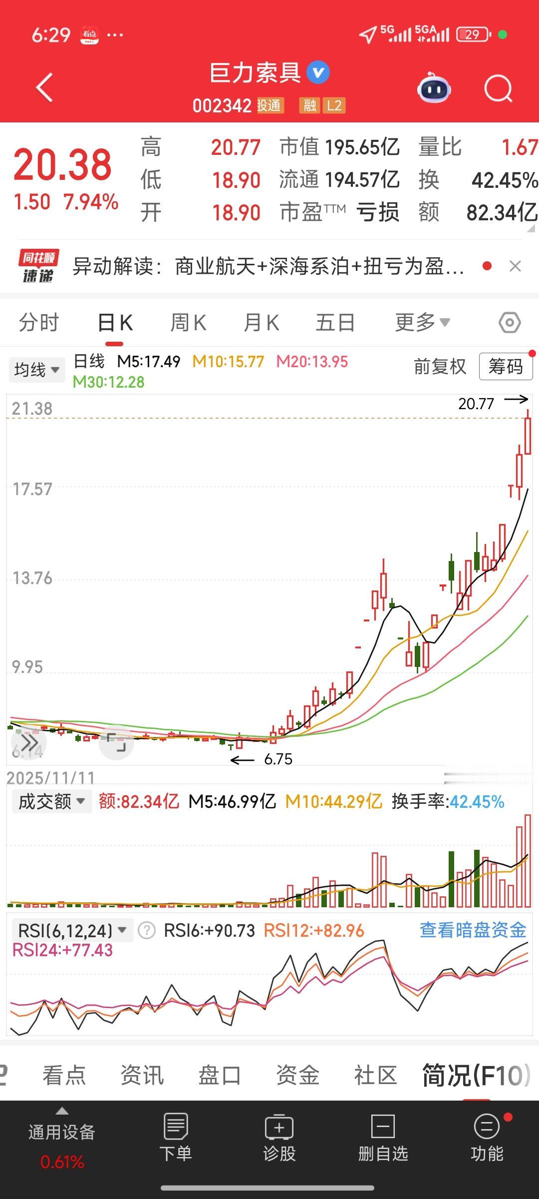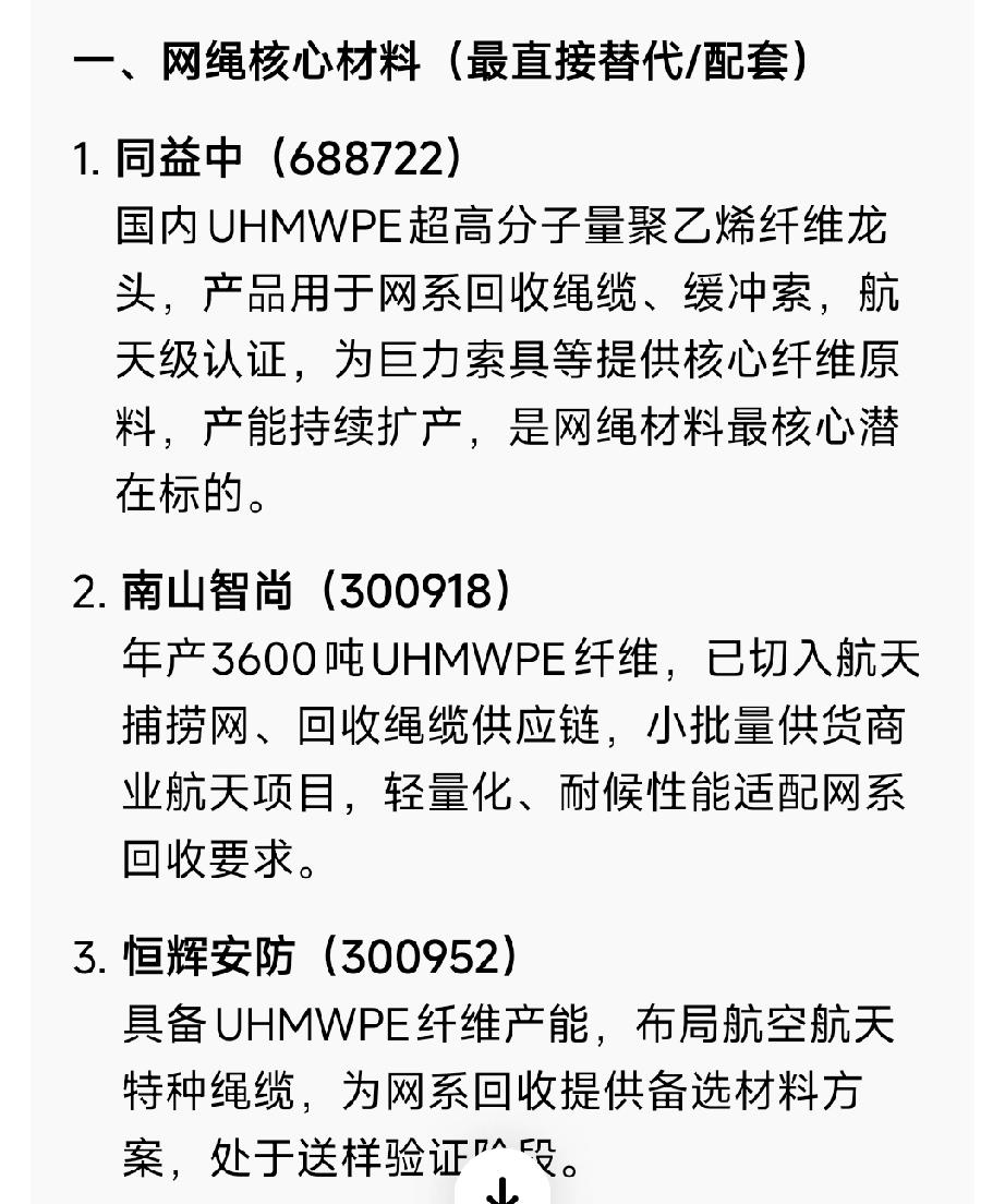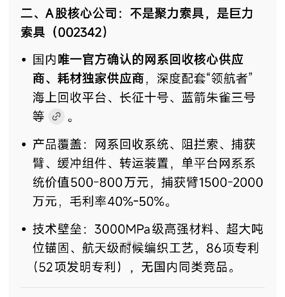 今年的大牛股巨力索具,涨幅将近10倍。2025年3月,它陡然迎来五六个涨停板,就此开启涨势。此后股价一路攀升,近一个月进入主升浪。其主要的炒作逻辑是航天火箭网兜回收。刚过去的周末传出消息,中国用网兜回收航天试验器获得成功,这估计会起到推波助澜的作用,具体来说,它应该会加速冲顶了。又错过一只大牛股啊,接下来我们来探寻一下,类似概念可能会衍生出哪些股票,看看有没有参与的机会。 巨力索具阻拦索 科力股份 展远索具 巨力公司 光伏索具 索具吊厂家 中力股份