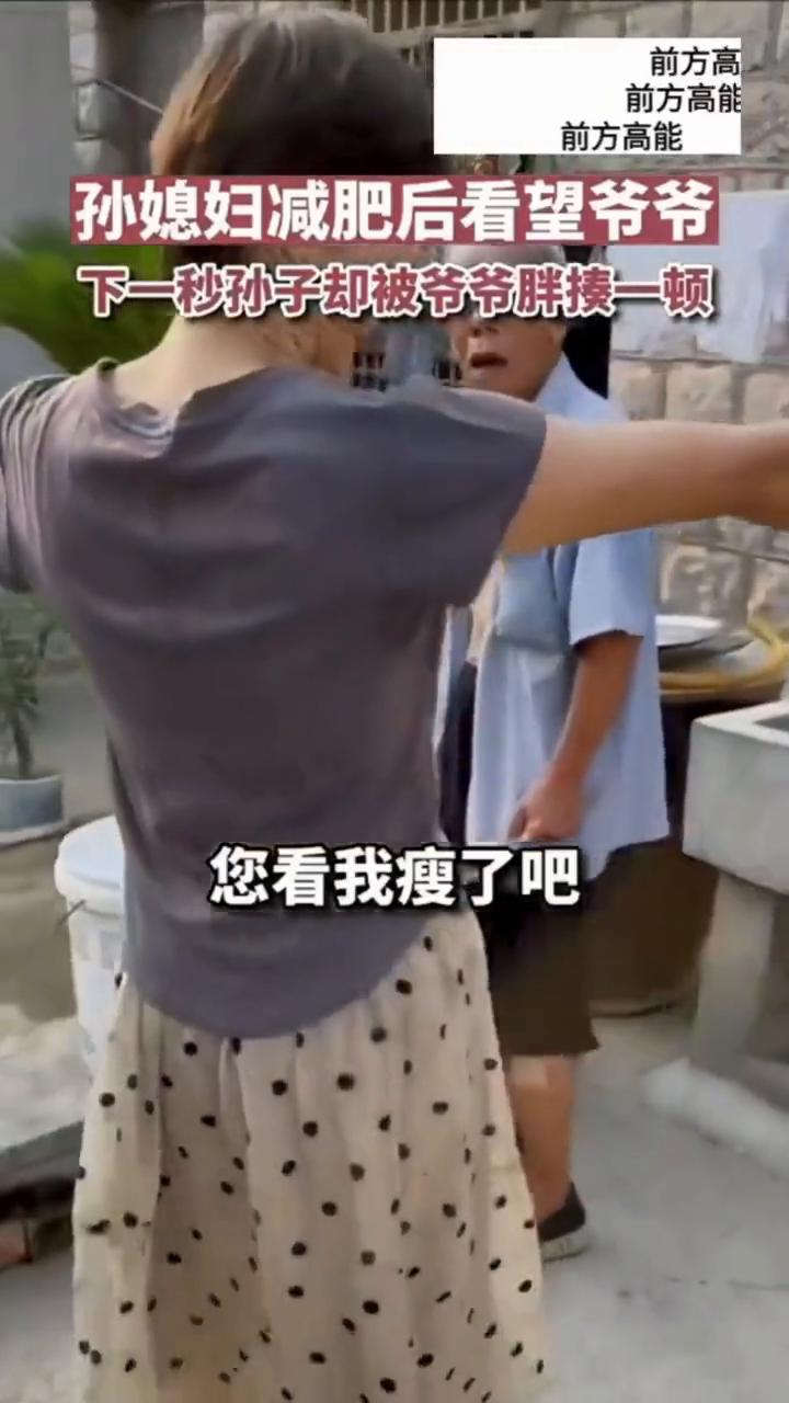 孙媳妇减肥后看望爷爷,下一秒孙子却被爷爷胖揍一顿。 前方高能。爷爷,您看我瘦了吧。我的天,看我这细胳膊。不是,人这么远嫁过来,你怎么能饿着人家。