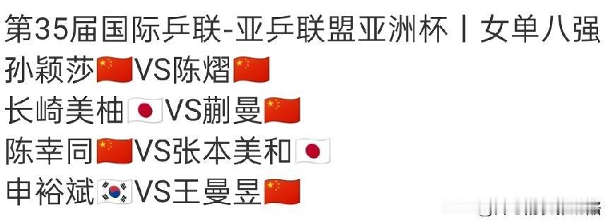 亚洲杯女单四强赛马上开始,期待提前包揽女单冠亚军。 孙颖莎和陈熠是内战,尽管陈熠美国大满贯赢了孙颖莎,但今晚想赢不容易。 蒯曼今晚对阵长崎美岫,上个月多哈冠军赛蒯曼4-1拿下,所以今天应该没悬念胜出。 陈幸同对阵张本美和,应该说有难度,去年仁川冠军赛,陈幸同4-2,今年多哈冠军赛就是4-3,而且决胜局打到17-15,说明张本美和确实涨球了,但陈博士也不是白给的,解题能力很强,期待同同能一路长虹。 王曼昱和申裕斌应该很轻松,北京大满贯4-1拿下,尽管小申胜桥本帆乃香,王曼昱不打削球会保存体力,但打小申也不会手软,一定会是速战速决。 四强赛就是七局四胜制,球迷和粉丝可以多欣赏精彩比赛。 加油国乒女队,期待可以锁定女单四强。 图片来自网络侵权可删。