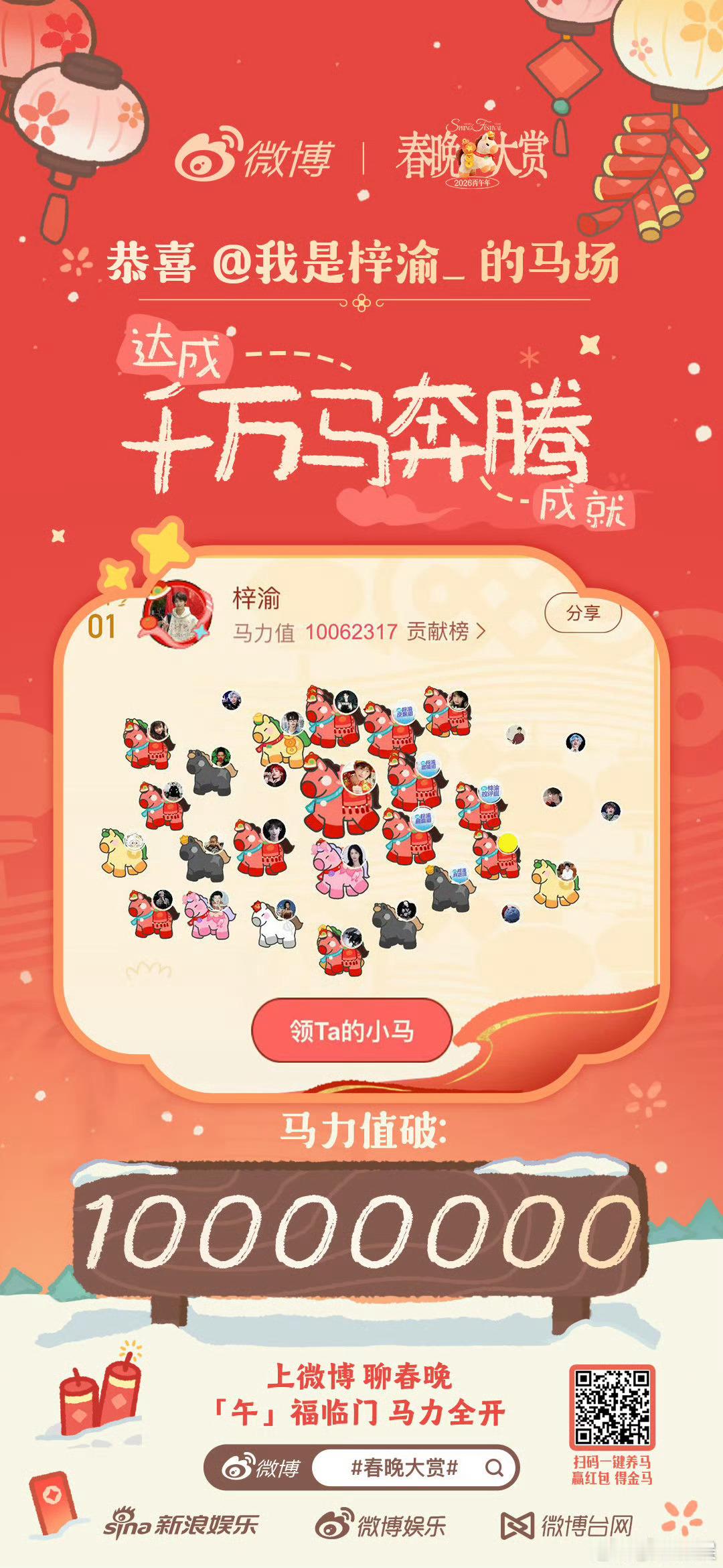梓渝首个马力值破1000万 马力狂飙,福气驾到!恭喜梓渝马力值强势突破1000万,也是第首个☝️YUNI们真是逢榜必断层哇~驰骋新岁,未来可期!春晚大赏新春茶话会新娱