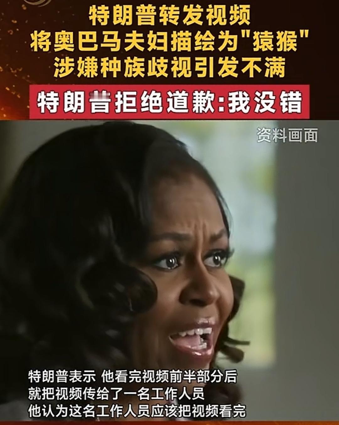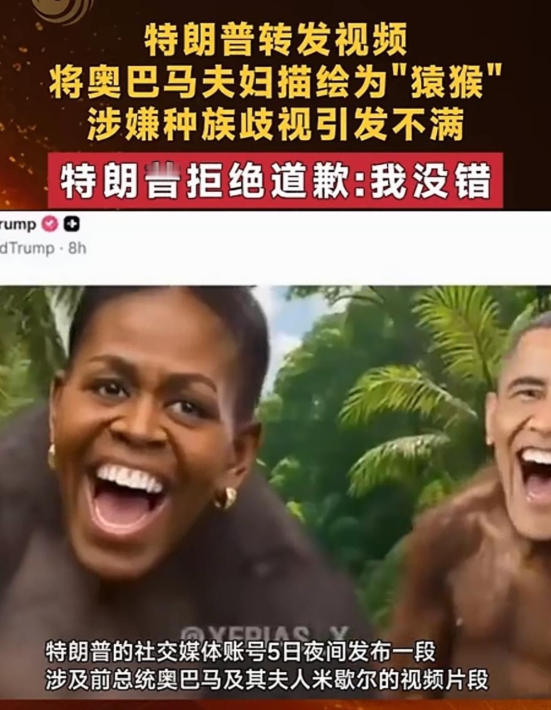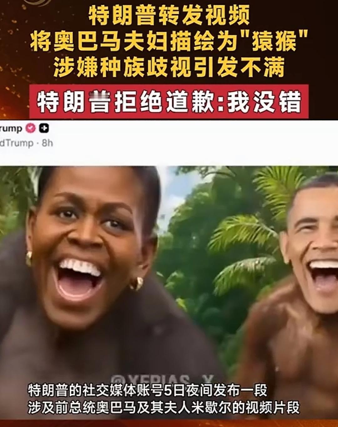 特朗普发视频将奥巴马夫妇比喻为猿猴,并拒绝道歉。不过,客观的说,我觉得特朗普的比喻挺贴切的,而且越看越像。您觉得呢?
