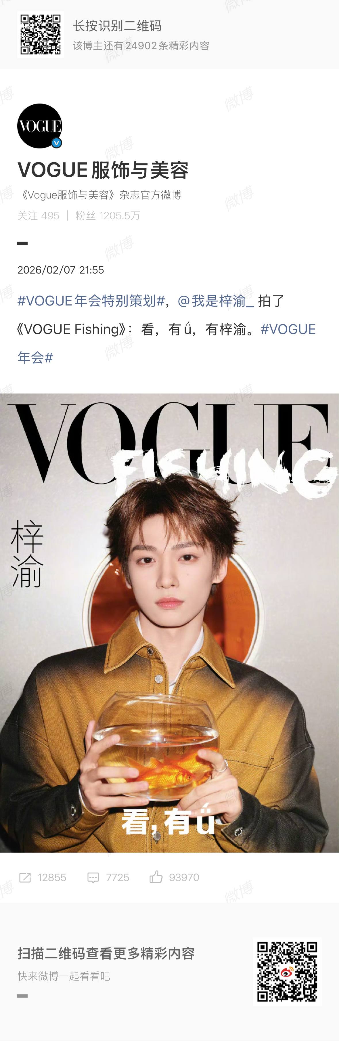 梓渝梓渝VOGUE手捧鱼缸封面照梓渝VOGUE年会封面照有鱼有小梓渝梓渝回应出席