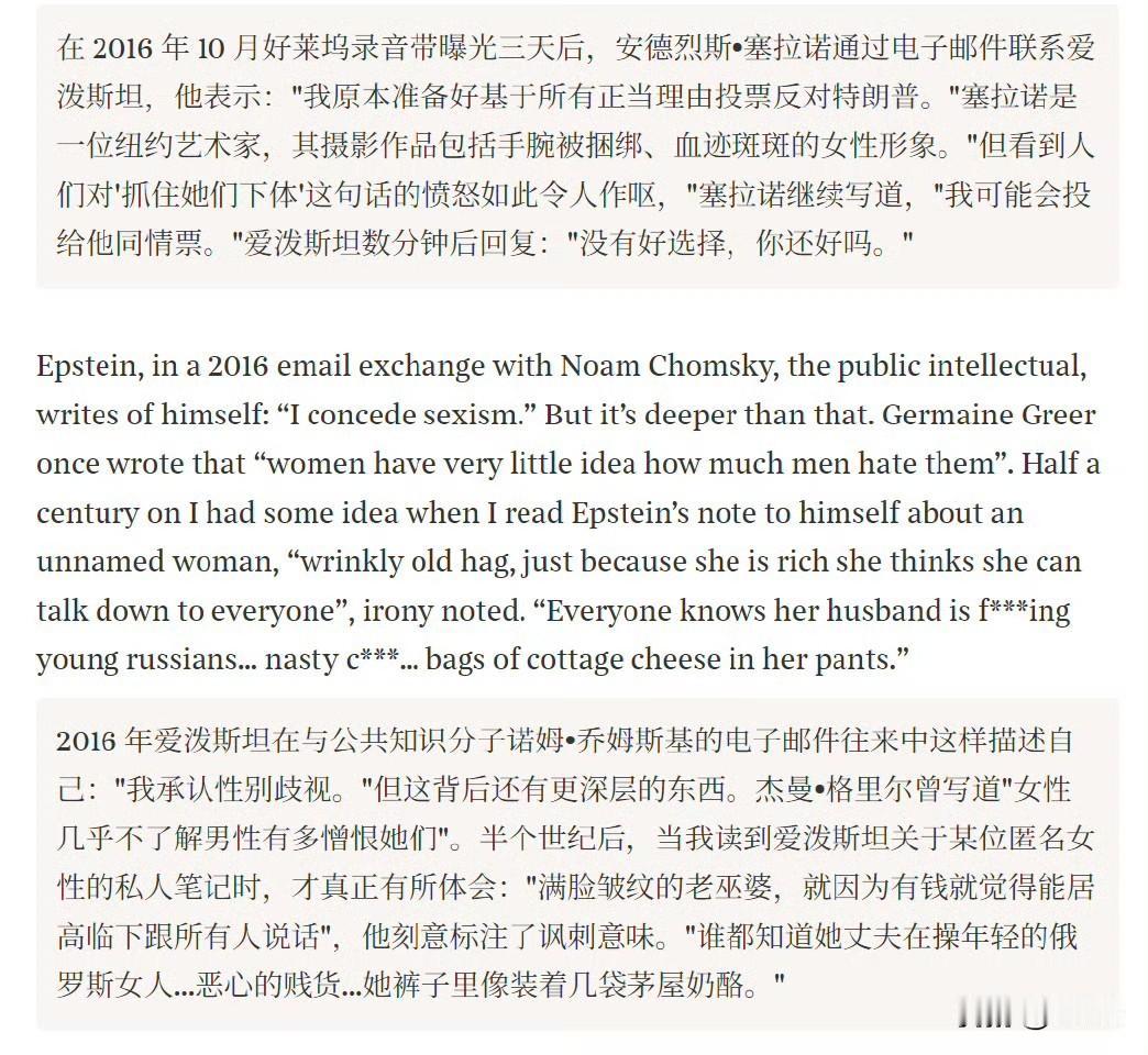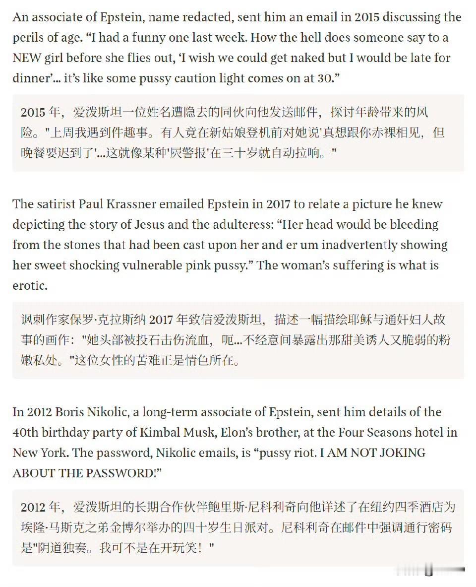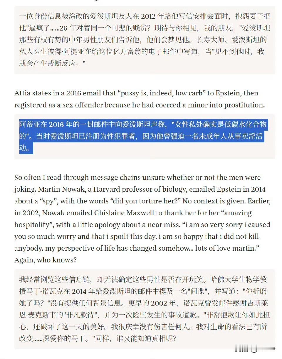 泰晤士报倒是煞有介事的以一篇文章讨论过爱泼斯坦的这些邮件,包括长寿大师、爱泼斯坦的私人医生彼得·阿提亚给爱泼斯坦的那封著名邮件:“pussy 确实是低碳水化合物的。”