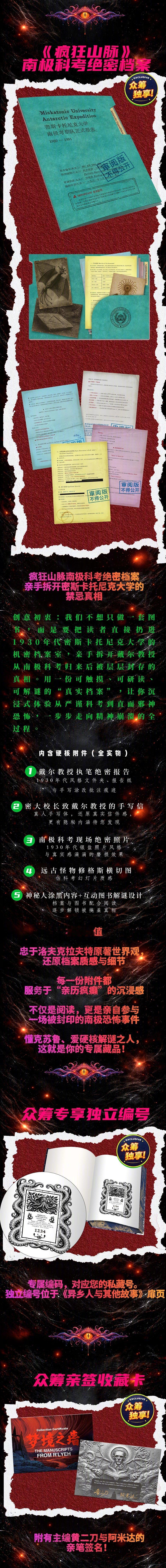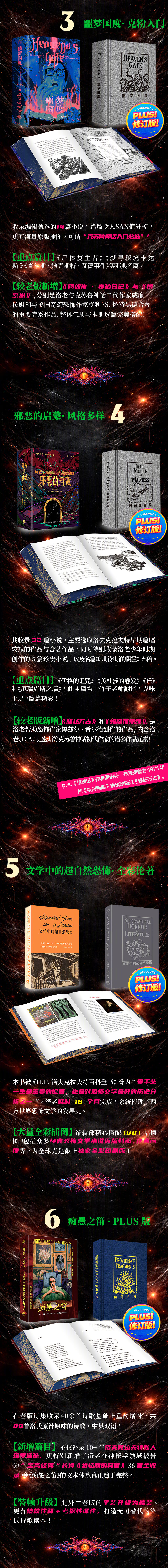 全彩双色沉浸式诡秘体验,全套共计110余篇、200余万字、总插画近400幅、总页数超3000页。不只有克苏鲁神话,而是囊括小说、诗歌、杂文、手稿等,更大量增补了此前从未面世的中文篇目。