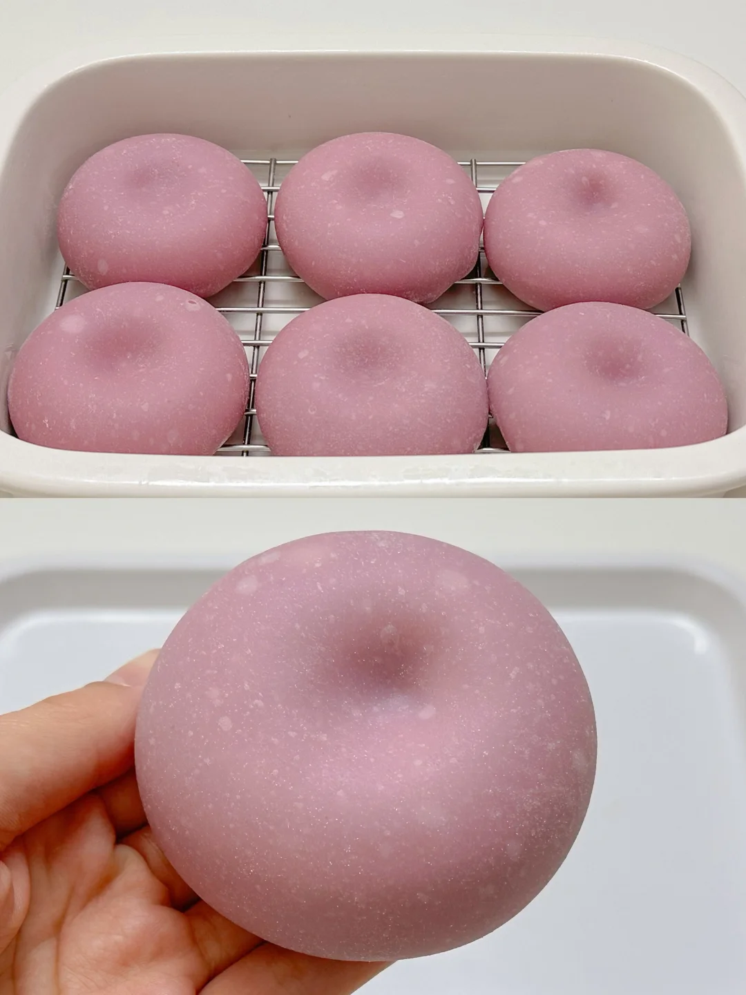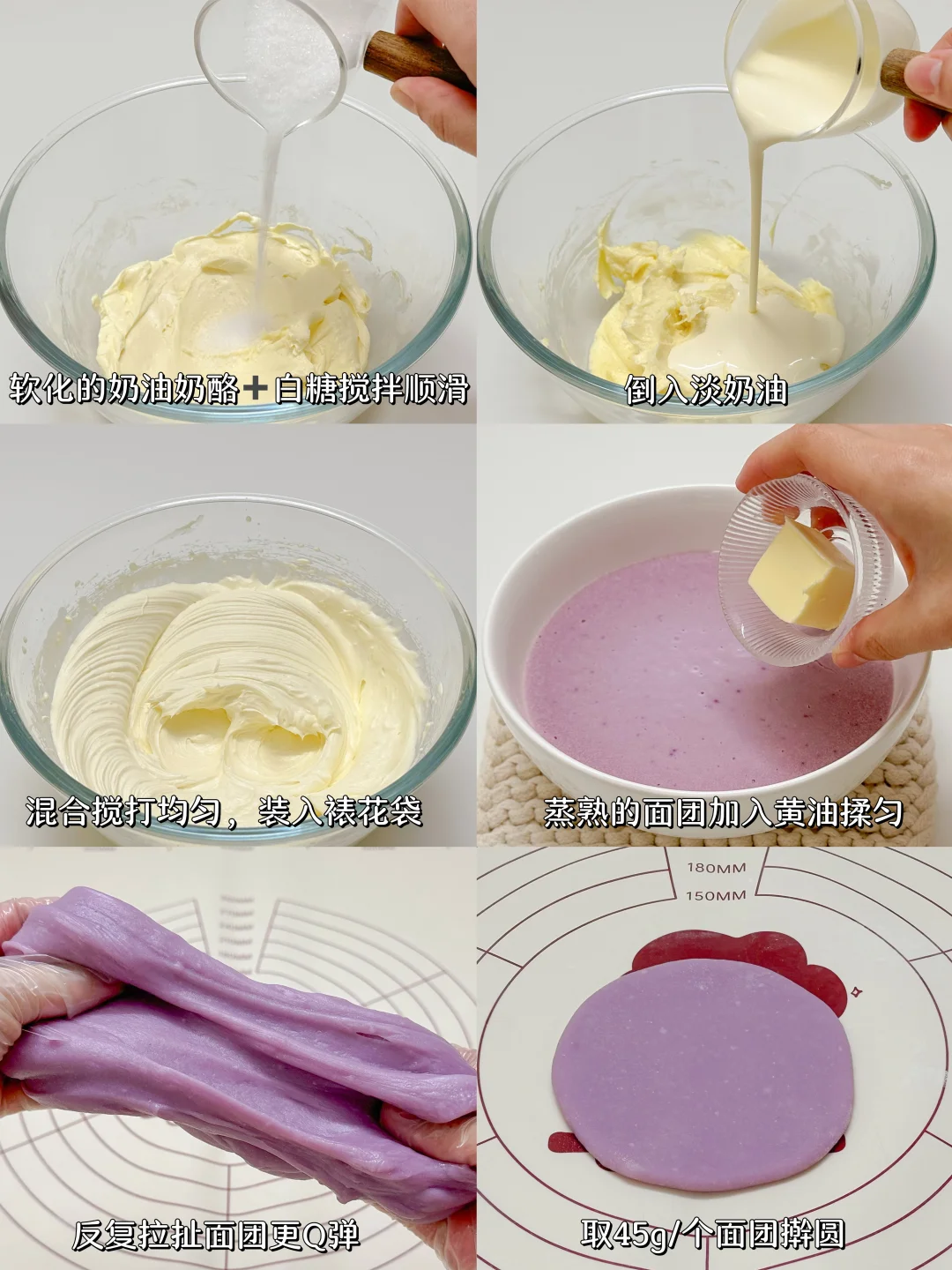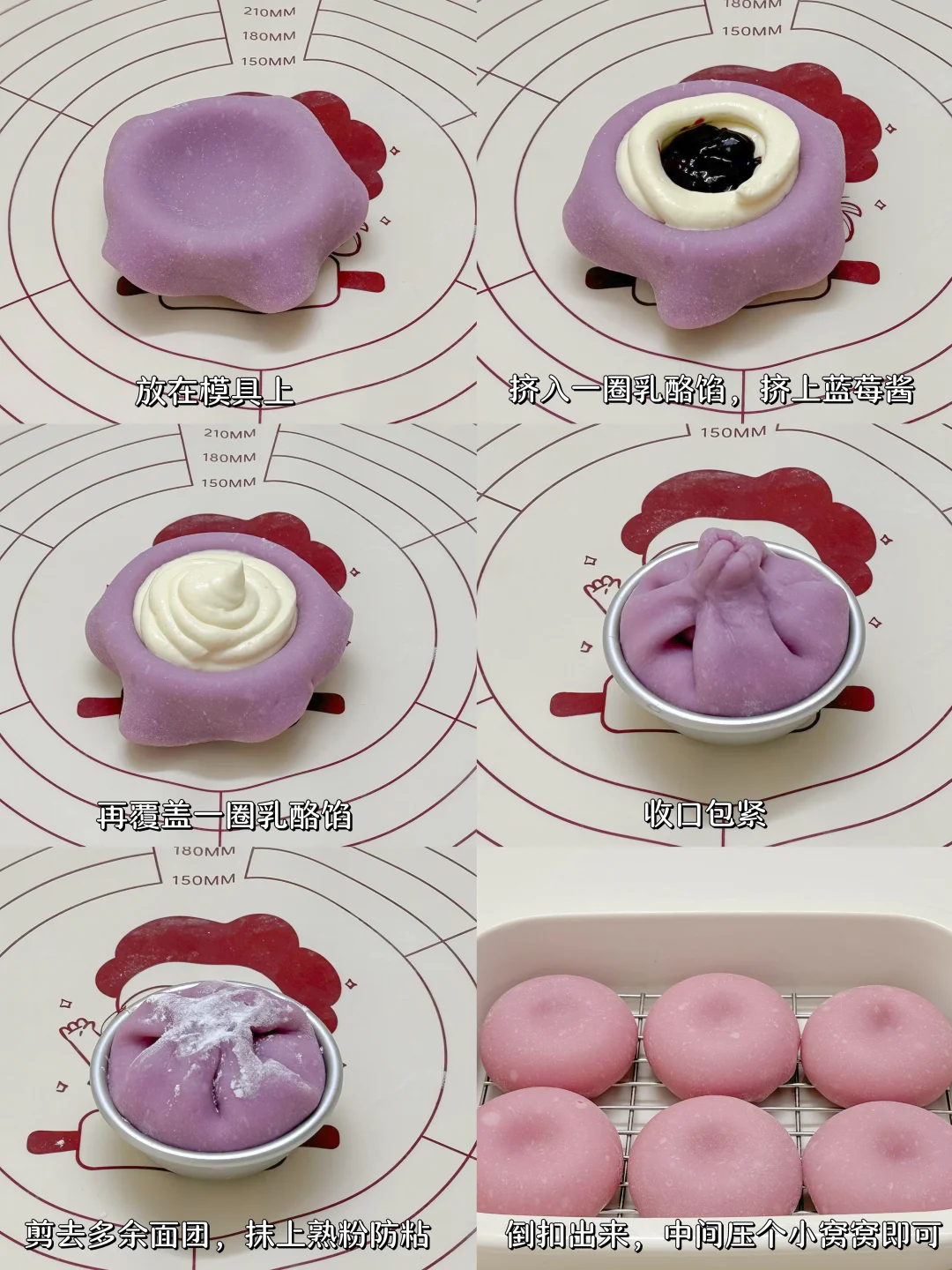 3️⃣蒸熟的面团加入黄油揉匀,反复拉扯面团更Q弹,取45g/个面团擀圆,放在模具上,挤入一圈乳酪馅,中间挤上蓝莓酱,再覆盖一圈乳酪馅收口包紧,剪去多余面团,抹上熟粉防粘,倒扣出来,中间压个小窝窝即可。