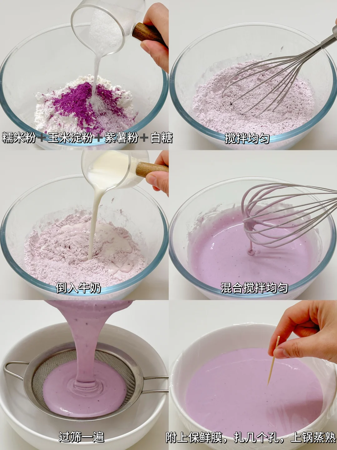 1️⃣糯米粉+玉米淀粉+紫薯粉+白糖搅拌均匀,倒入牛奶搅匀,过筛一遍,附上保鲜膜,扎几个孔,上锅蒸25分钟左右。