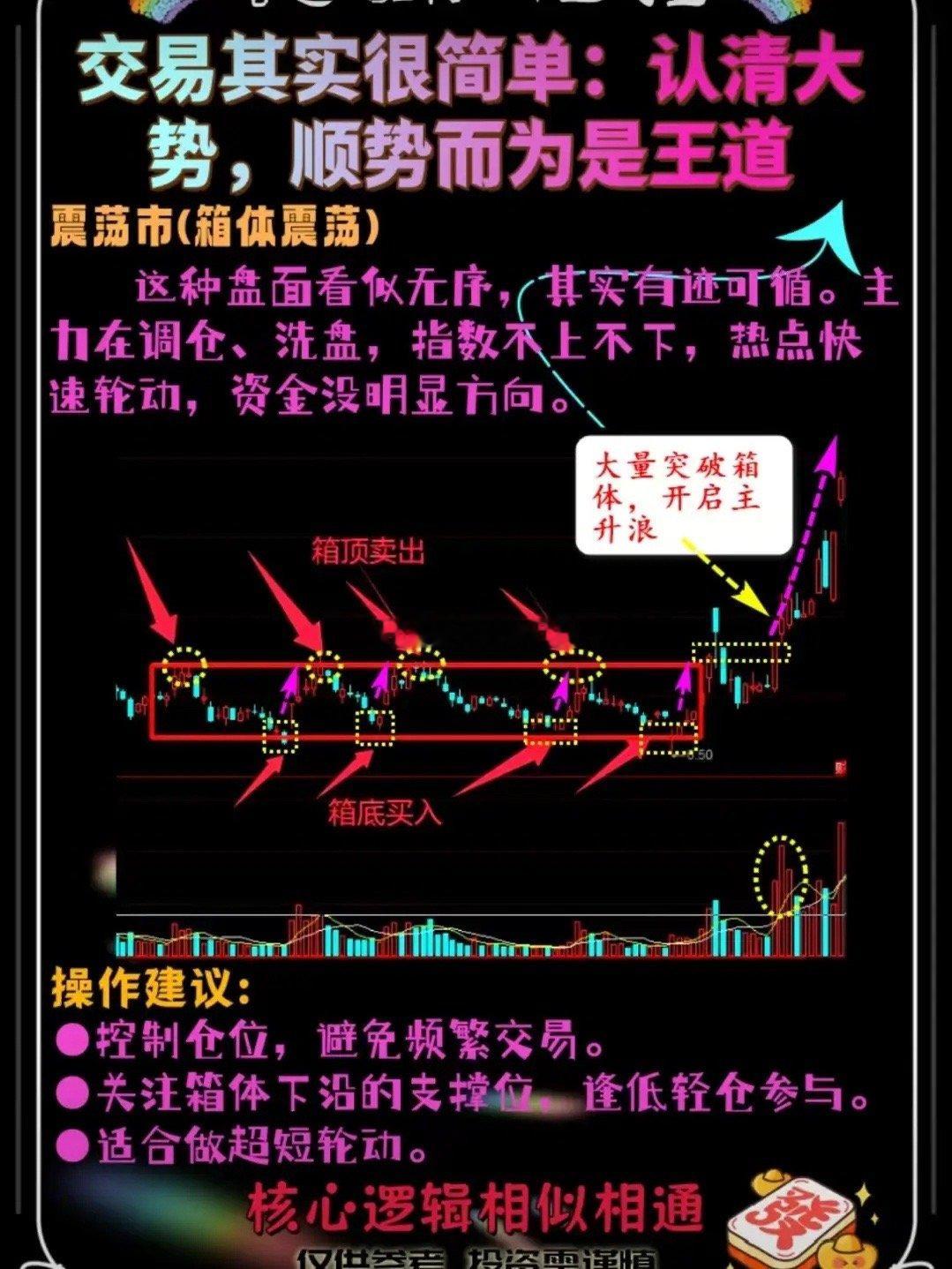 股票交易核心:认清大势,顺势而为 大势是根,个股是枝,根枯则枝败,顺势是交易的第一铁律,所有技巧都需依附大势,核心就3句话:先判大势方向,再定操作节奏,不与趋势对抗。一、一眼认清大势(3个核心信号,无需复杂分析)1. 看指数:沿5/10日均线向上=上升势,横盘震荡=震荡势,沿5日线向下=下跌势;2. 看量能:拉升放量、回调缩量=顺势,反弹缩量、下跌放量=逆势;3. 看赚钱效应:涨停家数>跌停家数、主线题材有持续性=可操作,反之则观望。二、不同大势的绝对操作准则(不越界、不侥幸)- 上升势:敢持股、敢加仓,轻仓试错+重仓追确认,赚趋势的波段钱;- 震荡势:轻仓快进快出,只做强势龙头,不格局、隔日套利为主;- 下跌势:空仓是最优解,任何反弹都是诱多,不抄底、不接盘、不幻想。三、顺势而为的底层心法(比技巧更重要)1. 放弃“抄底逃顶”的执念,趋势形成后再入场,宁可错过,不可做错;2. 个股形态再完美,若与大势相悖,直接放弃,逆势的肉都是带刺的;3. 顺势时,小止损博大收益;逆势时,任何操作都是高止损低回报。核心总结:交易的本质是借势,大势向上,遍地是机会;大势向下,处处是陷阱,认清大势,才能让所有操作有意义。