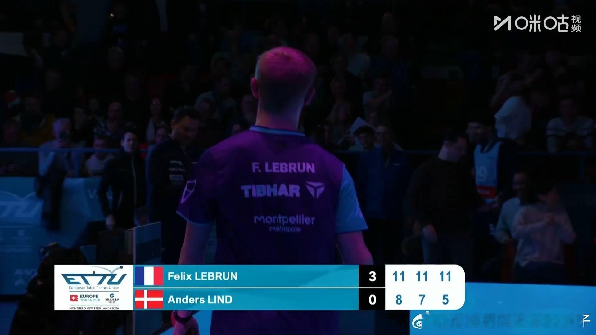 菲利克斯勒布伦3比0林德(8,7,5)晋级2026年国际乒联欧洲16强杯男单半决赛下一轮将对战艾利克斯勒布伦VS西蒙高茨的胜者法国队提前锁定一个决赛席位,F也获得了澳门世界杯的参赛资格