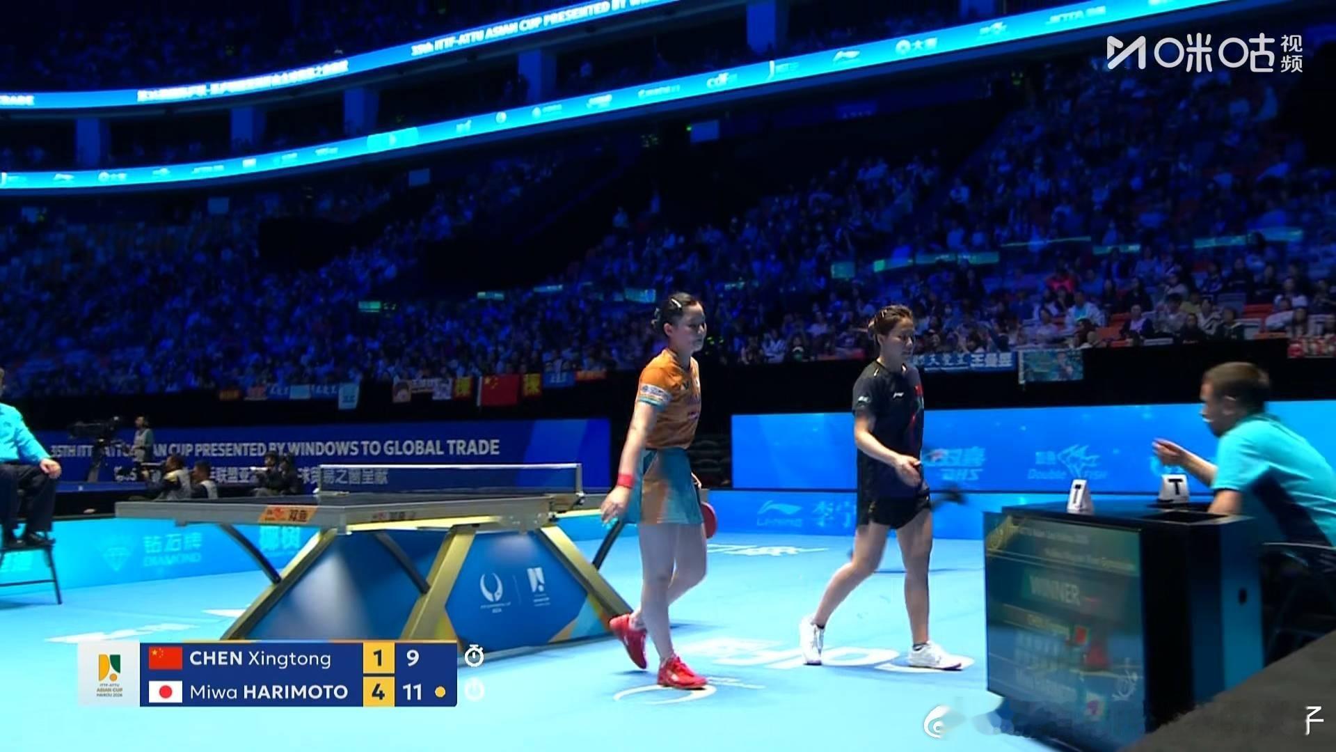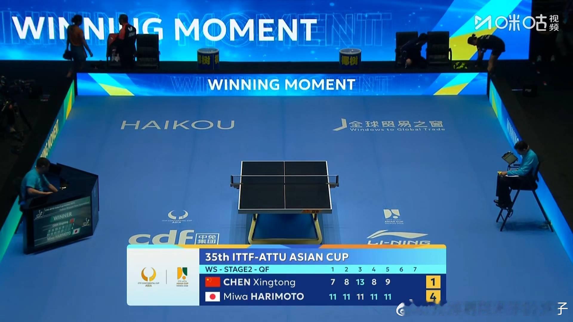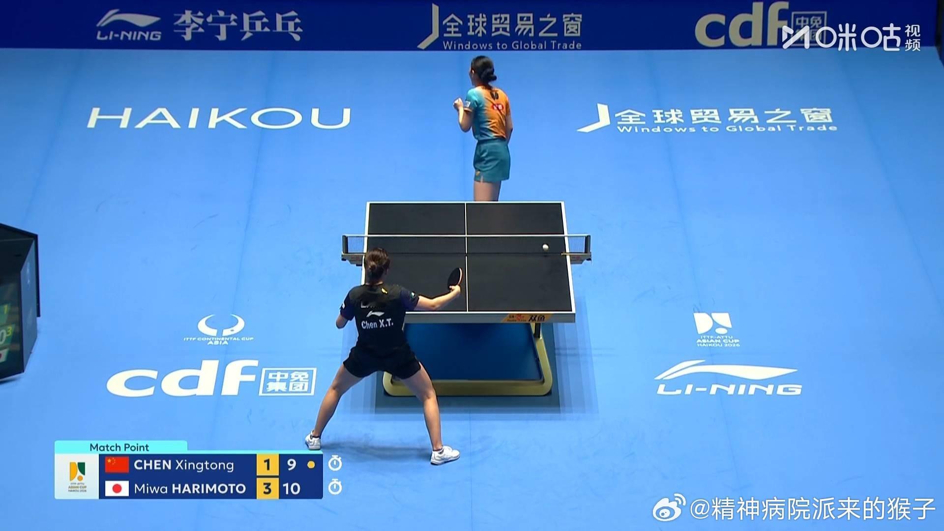 陈幸同1比4张本美和(-7,-8,11,-8,-9)止步2026年国际乒联海口亚洲杯女单八强张本美和下一轮将对战王曼昱VS申裕斌的胜者