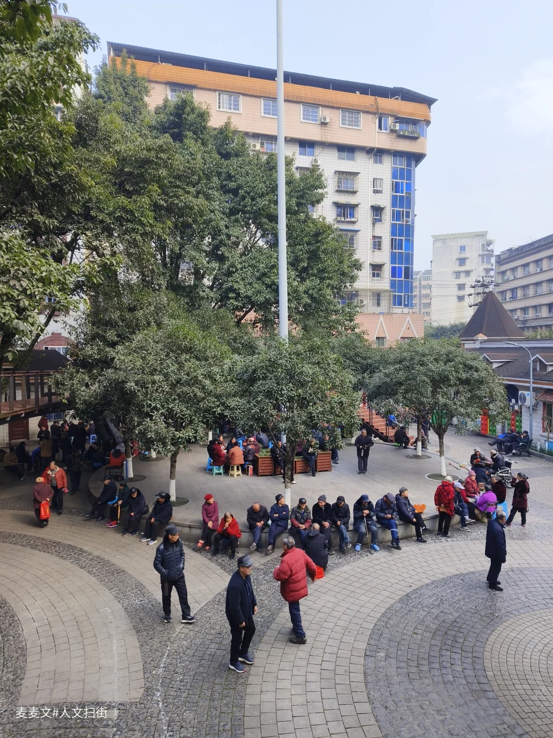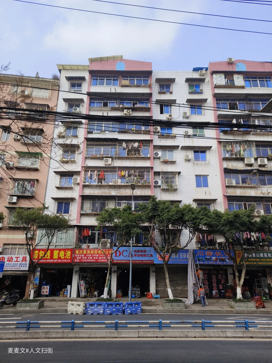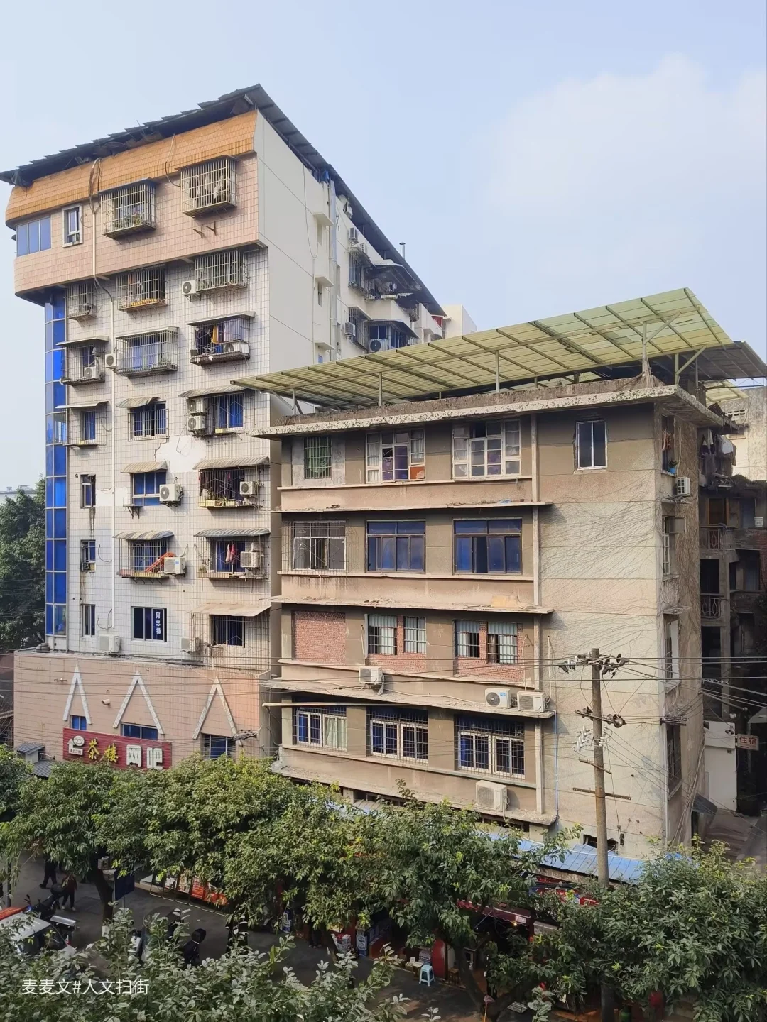 街上那栋带着蓝色弧形玻璃窗的千禧年风格老楼,米黄色外墙配着波浪形檐角,像一个停在时光里的符号,见证着这条街的变迁。楼下的五金机电铺子、现烤的酱香饼摊,还有坐在五星园晒太阳的婆婆爷爷,都在诉说着这里的烟火日常。