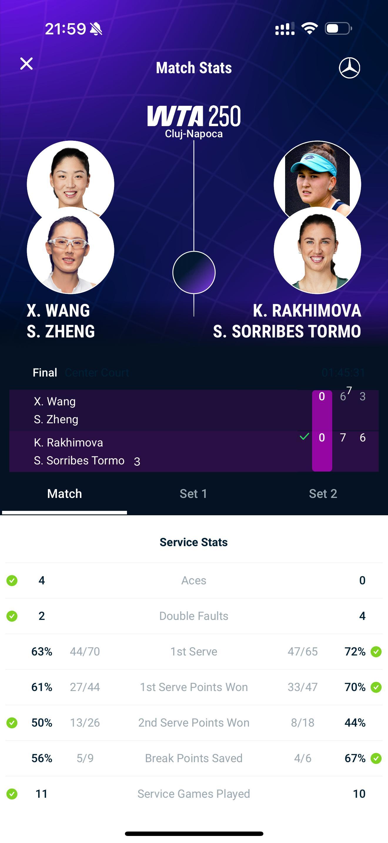克卢日纳波卡女双决赛,郑赛赛/王欣瑜首盘错失盘点,第二盘无力回天,以6比7、3比6不敌3号种子拉希莫娃/托莫,无缘冠军。网球talking大会
