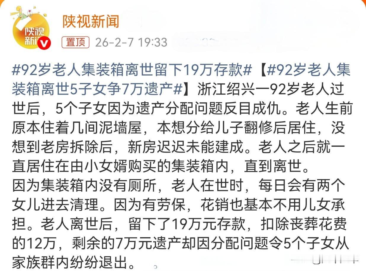 浙江一名92岁老人蜗居集装箱离世,留下的19万存款。 老人原计划将泥墙屋分给儿子翻修居住,但老房拆除后新房长期未建,被迫迁入小女婿购置的集装箱内生活。让人震惊的问题是丧葬费竟然高达12万! 如此高得丧葬费或许是与当地殡葬习俗及子女选择的较高规格服务有关。子女购置了价格不菲的墓地、举办隆重的告别仪式、购买高档骨灰盒等,尤其当子女为顾及“面子”而选择超出基本需求的殡葬服务时,总开销容易大幅增加。人活着不好好对待,死后却因自己的面子关系花费大额开销老人的子女有病吧?这是弥补没有对老人生前好好照顾问题? 92岁走了是喜丧。可养儿防老、多子多福?吃了多少苦受了多少罪,才能把五个子女拉扯大,老了连亲福都没享受到!一个爹能养五个子女,五个子女却养不了一个爹。以后我们这代人一定要好好照顾自己呀 别指望你们的儿女养老 也不要一个劲的为了儿女牺牲自己 舍不得吃穿 一定要对自己好 对自己的身体好 只有自己身体好 才不用去指望任何人 自己老了也不遭罪 !老年人离世