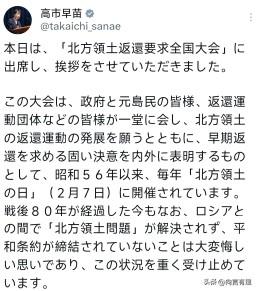 “刚惹完中国,又去招惹俄罗斯,高市早苗疯狂试探中俄底线,为什么如此疯狂? 高市早苗在日本大选投票的前夕,东京的寒风似乎格外刺骨,但这并没有挡住高市早苗“表演”的热情。她准时出现在“要求归还北方领土全国大会”上,发表了一通看似“情真意切”实则“包藏祸心”的演讲。 说什么“战争结束80年了,还没解决北方四岛问题,令人极其沮丧”;又说什么“恢复祭扫是人道主义问题”。听着这些话,我只有一个感觉:这哪里是为国为民的首相,分明是一个为了政治私利,不惜同时得罪中俄两大邻国的“危险赌徒”! 对俄拿着“悲情”剧本,演给谁看?高市早苗今晚最大的“卖点”,就是把日本塑造成一个“受害者”。她大谈特谈“故土情怀”,强调“未签和平条约”的遗憾,甚至把“祭扫墓地”上升到“人道主义高度”。 但我想问一句,历史的账,她算过吗?南千岛群岛(北方四岛)的归属,是二战反法西斯战争的胜利成果,是《雅尔塔协定》、《波茨坦公告》等国际法文件铁板钉钉定下的。这是对日本军国主义侵略历史的合法清算! 作为战败国,日本本应深刻反省,却总想着翻案。更讽刺的是,她一边喊着要“互谅”,一边紧随西方对俄制裁,直接导致俄日和平条约谈判无限期中止。现在跑出来装“受害者”,把激化矛盾的责任撇得一干二净,这不叫虚伪叫什么? 对华疯狂试探红线,引火烧身,如果说对俄是“旧怨”,那对华就是她主动挑起的“新仇”。 别忘了,就在不久前,她在国会公然将“台湾有事”与日本“存亡危机事态”绑定,甚至暗示自卫队可武力介入。这已经不是简单的“擦边球”,而是赤裸裸地干涉中国内政,挑战一个中国原则的底线! 在二战胜利80周年的特殊节点上,她不反思日本对亚洲各国的侵略历史,反而在台湾问题上大放厥词。这种“引火烧身”的操作,难道不是要把日本推向地缘政治的风暴眼吗? 为何如此疯狂?因为她在“走钢丝”,为什么高市早苗敢同时惹怒两个大国?因为她很清楚,在日本国内,有一群躁动的右翼势力和渴望“大国地位”的选民。 她利用“北方领土”情结和“台海焦虑”,煽动民族主义情绪,本质上是为了在即将到来的众议院选举中捞取政治资本。她把复杂的地缘政治简化为“非黑即白”的口号,把严肃的历史问题扭曲为“悲情叙事”。这种做法短期内或许能收割掌声,但长期看,只会让日本陷入空前的孤立。 高市早苗最大的算盘打错了。她以为跟着美国制裁就能让俄罗斯低头,以为勾连外部势力就能在台海问题上讨价还价。但她忘了,现在的俄罗斯已经放出话来:南千岛群岛主权不容讨论,并且罕见地与中国立场联动。 中国也早已严正警告,日本若在台湾问题上越线,必将付出代价。中俄在战略安全上的默契,绝不是日本几句狠话就能打破的。当她喊出“终极手段”时,恐怕连她自己都知道,那不过是纸老虎的咆哮。 高市早苗的这种“疯狂”,说到底是对历史的无知和对现实的逃避。她试图用激进的对外强硬来掩盖国内治理的无力,用虚无的“大国梦”来麻痹民众。 但这只会让日本陷入更深的困境。当外交变成了表演,首相变成了演员,受伤害的终究是那些渴望和平与安稳的普通日本国民。 各位朋友,你们怎么看这种“走钢丝”式的政治表演?是觉得她强硬有担当,还是觉得她在把国家往火坑里推?欢迎在评论区留下你的真知灼见,我们一起聊聊!