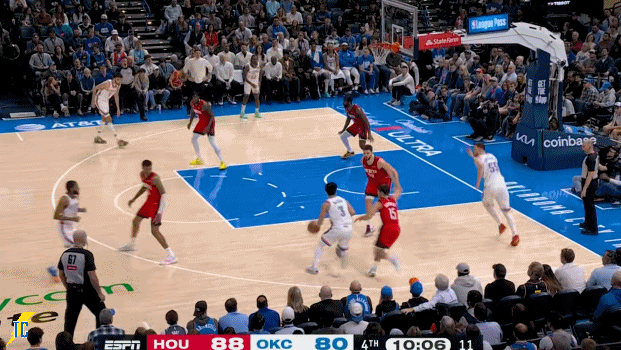 麦凯恩分球卡森华莱士投进三分,随后卡森自己单打申京中投打进!火箭vs雷霆雷霆76