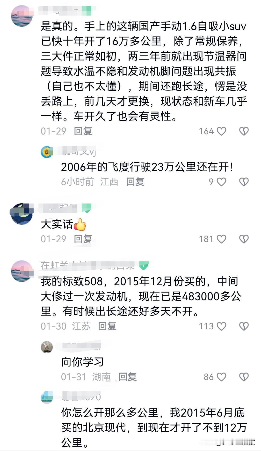 千万不要轻易换掉陪你多年的老车,看完这些车主的真实经历,真的破防了。 有人开国产手动小SUV,快十年16万公里,除了常规保养,三大件依旧坚挺,小毛病修完依旧跟新车一样,陪他跑遍长途从未丢在路上。 有人2006年的飞度,23万公里依然在岗,兢兢业业从不掉链; 有人15年的标致508,48万多公里,大修过依然坚守岗位。 这些老车哪里是代步工具,分明是陪你风里雨里的老伙计。 车真的有灵性,尤其是陪你超过五年的车。 它记得你上下班的路线,熟悉你踩油门的力度,懂你刹车的习惯,一人一车,早已磨合得天衣无缝。 你爱惜它,它就安安稳稳载你回家,从不闹脾气; 你总嫌弃它旧了、腻了,念叨着换车,电瓶亏电、小故障就会悄悄找上门,真的不是巧合。 只要三大件无恙,小毛病可修,就别轻易抛弃老车。 它装过你的疲惫,载过你的家人,陪你奔赴过远方,见证过你无数个平凡又珍贵的日常。 新车再好,也比不过陪你熬过岁月、知你冷暖的老伙计。