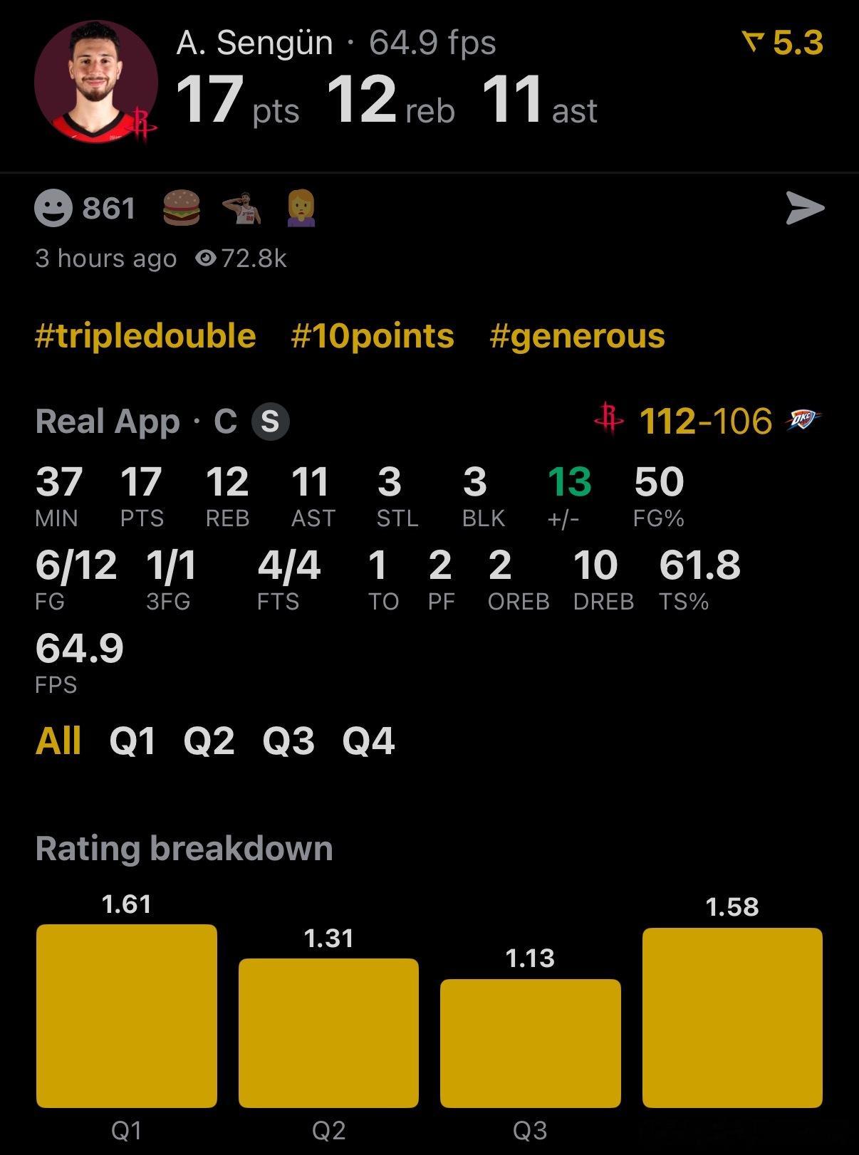 休斯顿火箭 NBA球员评分 申京-我的评分:经济型三双+铁血防守!!申京今天数据📊