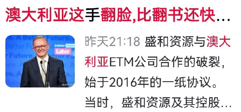翻脸比翻书还快!澳大利亚一边打达尔文港主意,一边撕毁中企合作协议,这不是明抢是什么? ETM公司2016年濒临破产,中国盛和资源注资相助,十年累计投资超2400万澳元。如今公司稍有好转,立刻毁约投向美澳稀土联盟。可没有中国技术,稀土矿不过是石头一块。 达尔文港同样令人心寒。2015年岚桥集团斥巨资租下并投入超10亿升级,盘活港口、创造数千岗位。澳政府为迎合美国,无视三次安全审查“无风险”结论,执意收回。 澳大利亚盲目追随美国,却不知对方只看重其战略棋子价值。此举既需支付天价赔偿,更自毁国际信誉——今日背信弃义,明日谁敢再来投资? 对此你怎么看?