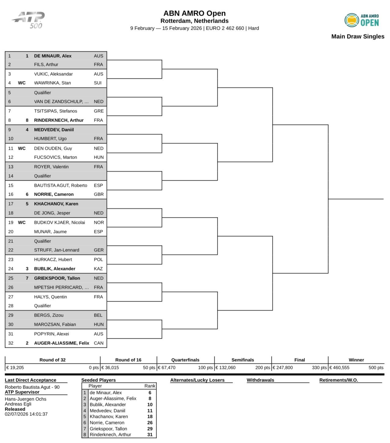 网坛风云 鹿特丹500赛公布正赛签表,德米纳尔、阿利亚西姆、布勃里克、梅德韦杰夫位列前4号种子,瓦林卡持外卡出战首轮对阵武西奇。网球talking大会