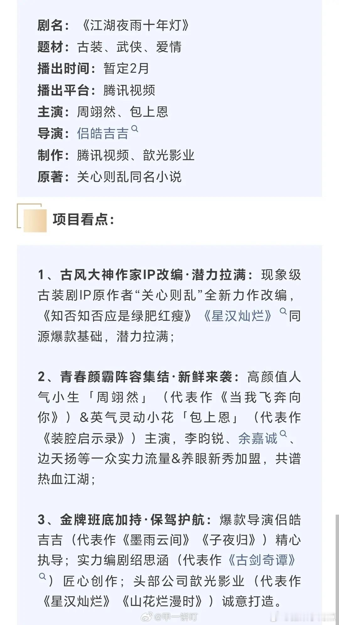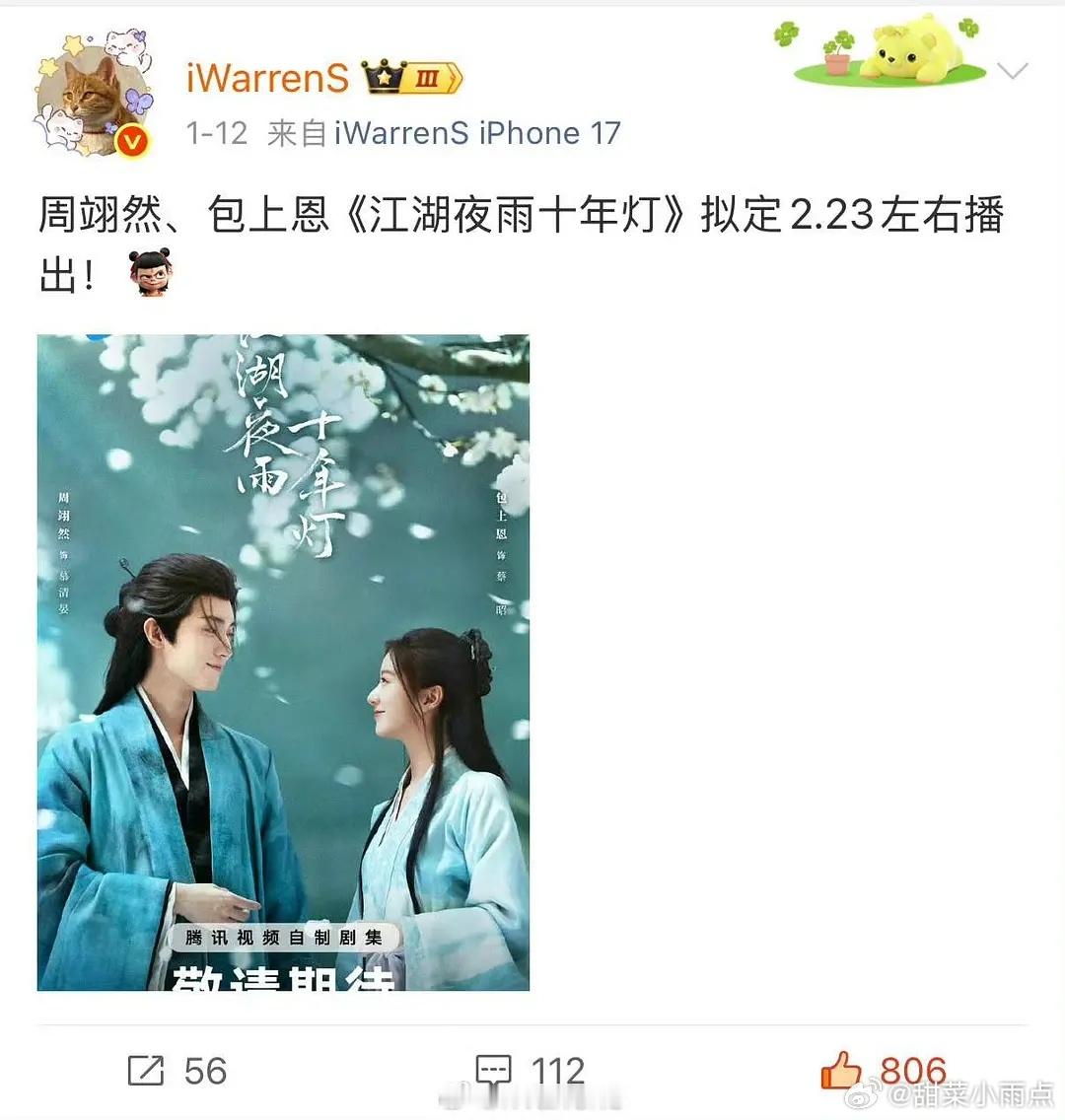 网传周翊然 包上恩《江湖夜雨十年灯》拟定 2.23 左右
