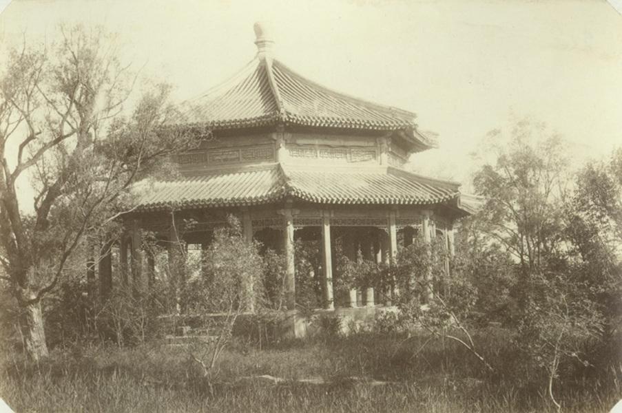 这是法国驻华公使谢满禄在1882年拍摄的颐和园中的“顺木天”楼阁,是晚清皇家园林留存至今的珍贵影像。 “顺木天”之名取自中国传统“天人合一”的理念,寓意顺应草木生长的自然节律,与颐和园“虽由人作,宛自天开”的造园思想高度契合。 照片拍摄于1860年英法联军焚毁清漪园之后、1886年颐和园大规模重建之前。画面中建筑主体虽残存,但周边植被荒疏、杂草丛生,真实反映了园林在战乱后的破败与待兴状态。