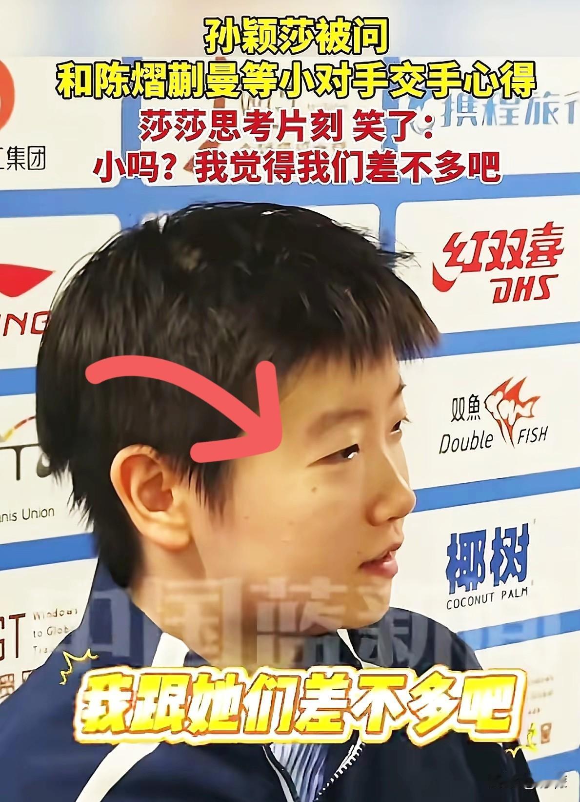 看到孙颖莎说“他们小吗”, 我懵了!这可是国乒采访, 这么正式的场合,第一眼误以为莎莎真把队友当小孩了。结果她笑着补了句:“我觉得我们差不多吧。” 当时镜头怼得很近,能清楚看到莎莎眼里的笑意,嘴角还带着点狡黠的弧度。旁边的队友一听,都忍不住笑出了声,原本有点严肃的采访氛围,瞬间就松快下来了。 其实熟悉孙颖莎的都知道,她说话就这风格,直来直去的,带着股子少年气。上次混双夺冠后采访,记者问她“现在觉得压力大吗”,她愣了下,直接说“还好啊,打球嘛,赢了就开心,输了就练呗”,一点都不绕弯子。 这次估计也是没多想,脱口就问了那么一句。毕竟国乒队里的氛围一直都这样,平时训练时互相调侃是常事,到了正式场合,这份轻松劲儿也没藏住。你看她补那句话的时候,眼神扫过旁边的队友,带着点“开玩笑啦”的意思,队友们也都心领神会,脸上的笑意藏都藏不住。 有网友说她“情商低”,这话就有点过了。竞技体育里,这份直爽其实挺难得的。总比那些说套话、打官腔的采访有意思多了。再说了,“他们小吗”后面跟着“我觉得我们差不多吧”,既没真把队友当小孩,又透着股亲近劲儿,说明平时大家相处得是真融洽,没那么多隔阂。 你看采访里,队友听到这话,非但没生气,还跟着笑,甚至有人伸手拍了拍莎莎的胳膊,那互动自然得很。这要是关系不好,哪能这么随便开玩笑啊。国乒队能一直保持好成绩,除了过硬的技术,这种轻松又团结的氛围,估计也是秘诀之一吧。 不像有些采访,问来问去都是“感谢国家感谢教练”,听着是没错,但少了点真人味儿。莎莎这两句大白话,把运动员之间那种并肩作战的熟稔感全说出来了,反倒让人觉得,哦,原来赛场上厉害得让人仰望的国手,私下里也跟咱们身边的朋友一样,会互相开开玩笑,会有这种不设防的瞬间。 而且这话里藏着的自信也挺打动人的。“我们差不多吧”,既没抬高自己,也没贬低队友,就那么大大方方承认“大家都是一起努力的伙伴”,这种心态多好啊。不像有些场合,非要比个高低,说些“我比他们更有经验”之类的话,反倒显得生分。 镜头里的莎莎还在笑,眼睛亮晶晶的,一点都没有因为说错话(其实也不算错啦)而紧张。旁边的教练也跟着点头,脸上是那种“这孩子就是这样”的宠溺。估计这就是国乒的传承吧,不光传技术,还传这种坦荡又真实的性子。 各位读者你们怎么看?欢迎在评论区讨论。