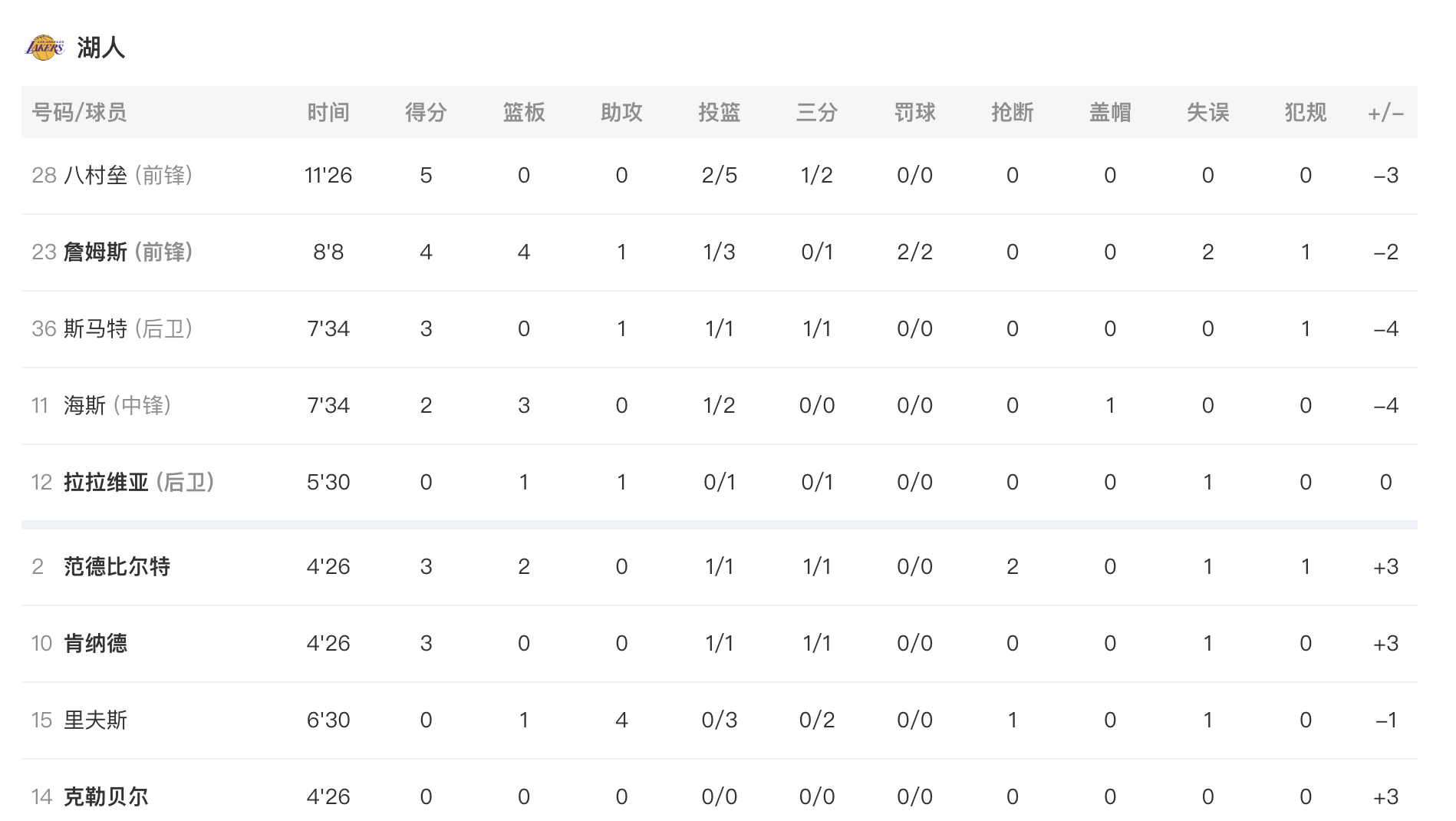 詹姆斯4分4篮板1助攻,里夫斯1篮板4助攻,八村5分,海斯2分3篮板,斯玛特3分1助攻,范德彪3分2篮板,肯纳德3分。