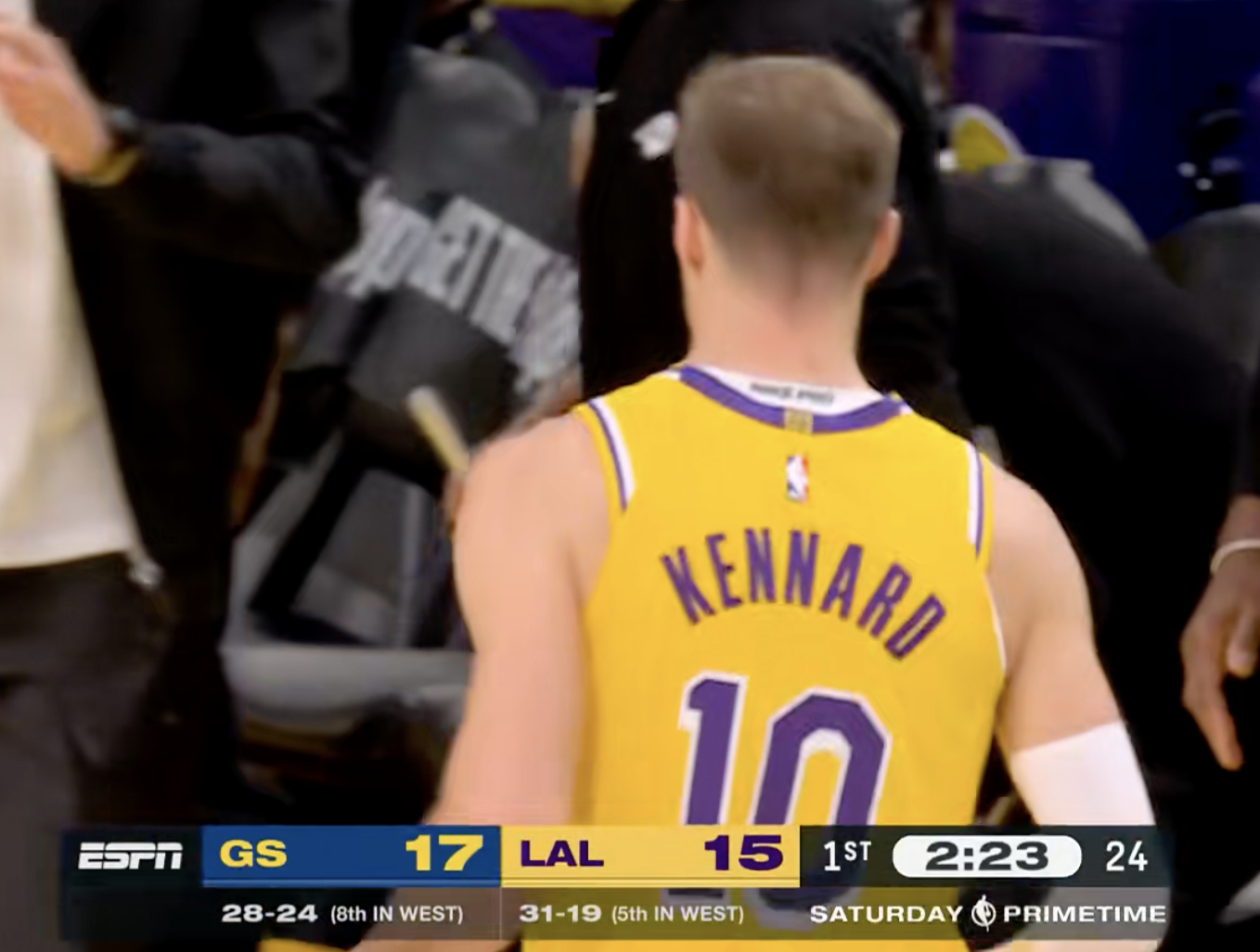 肯纳德,第一次出手,投进三分!!! 湖人15-17勇士,对面暂停!勇士vs湖人