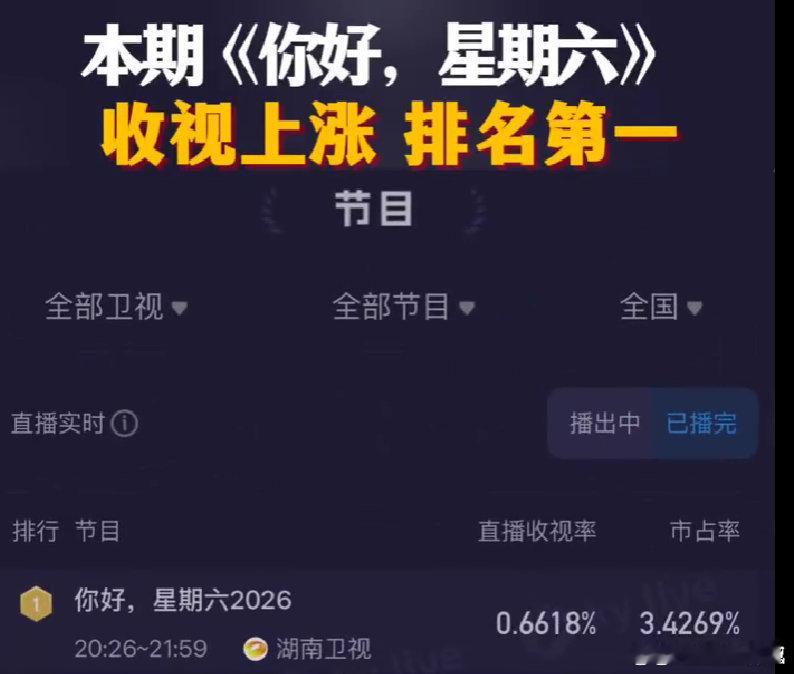 你好星期六收视率第一你好星期六本周《你好,星期六》实时收视率0.6618,峰值0.7077,省级卫视排名第一,实至名归!