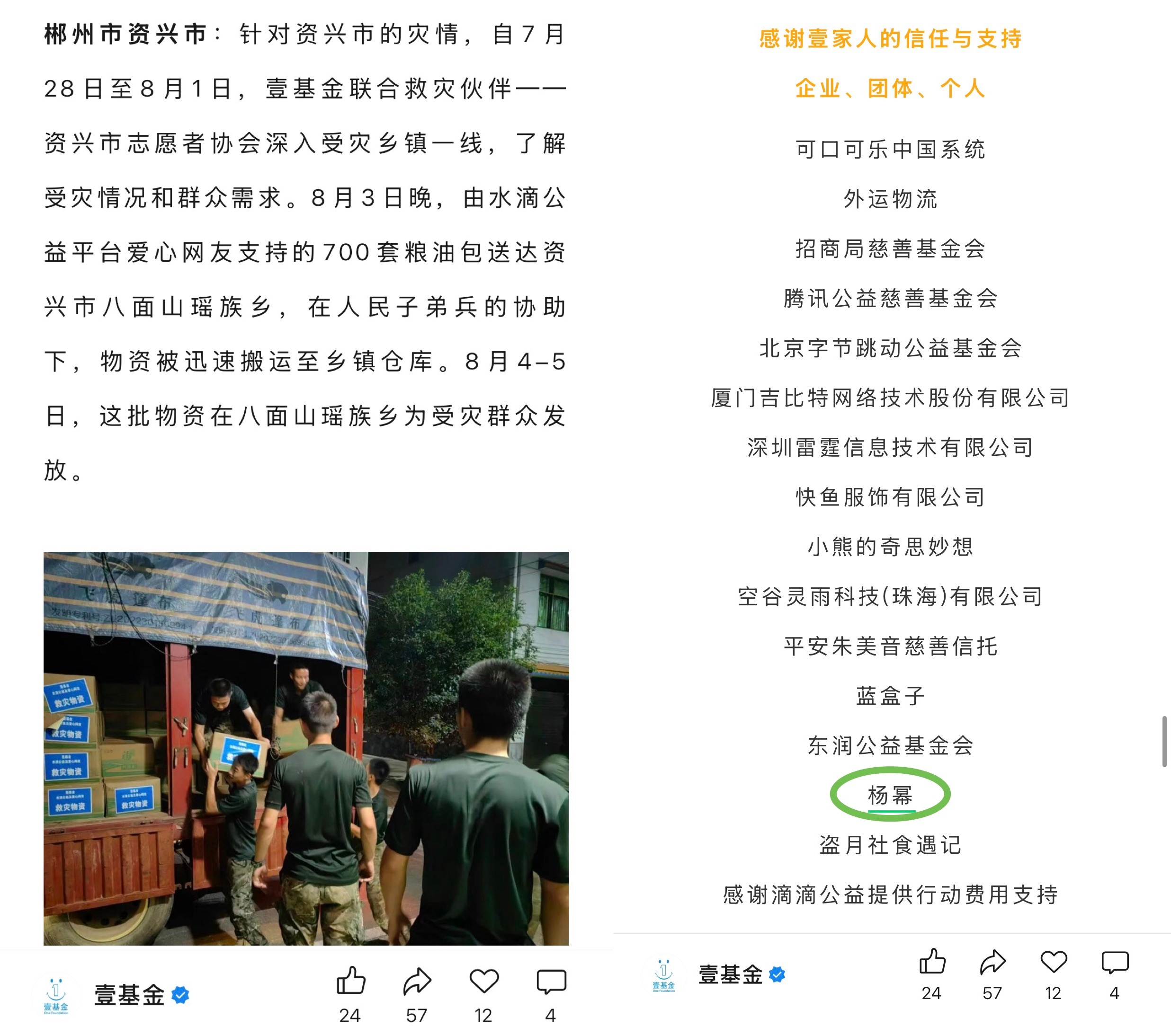 杨幂正能量 呜这真是网友不说不知道的程度24年8月初,湖南省资兴市因受台风“格美”影响,遭遇了严重的自然灾害,出现断水,断电及通信,交通中断问题。杨幂关注到灾情,并携壹基金捐赠了100万的救灾物资。这个灾情没有当时上太多新闻,很多人没有关注到,但是杨幂留意了,然后默默做好事做公益,昨天被网友分享出来我们粉丝才知道顶好顶好的幂啊!
