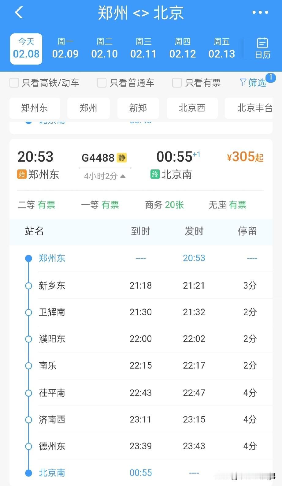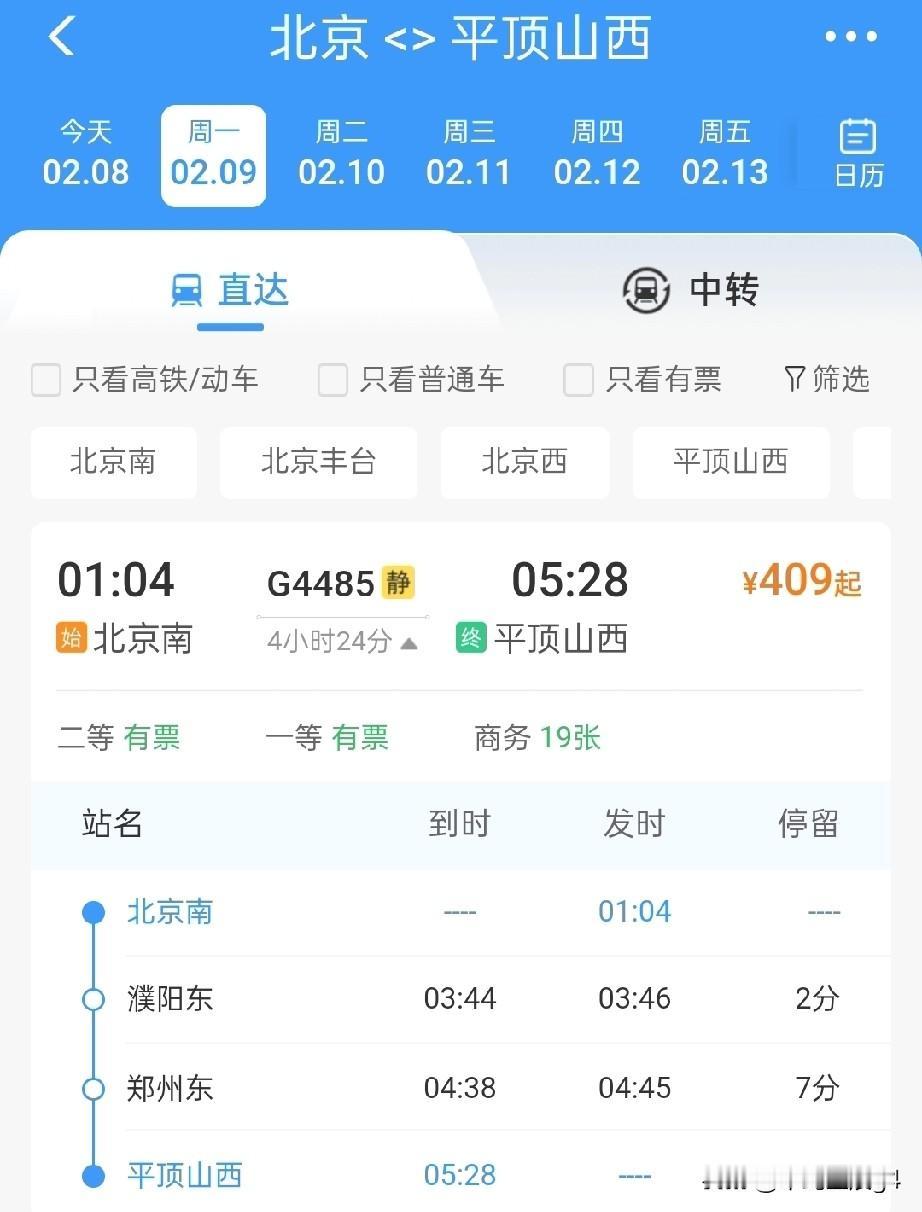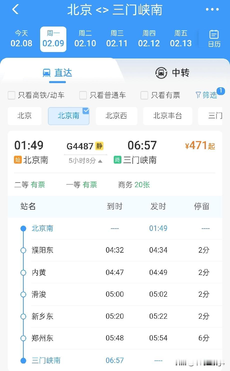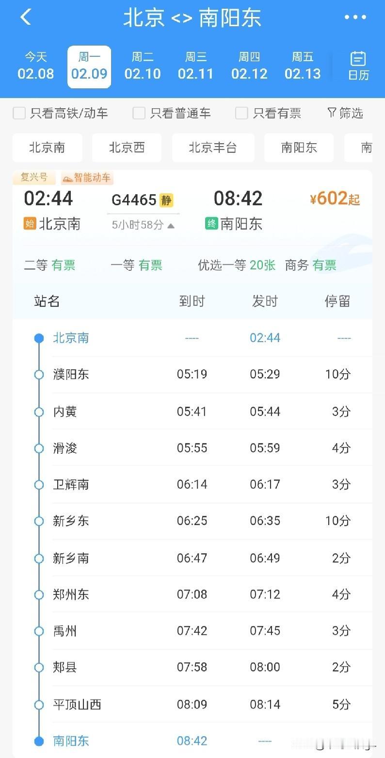 2月8日起,郑州东至北京南始发开行两趟临客高铁,2月9日,北京南至平顶山西、南阳东、三门峡南开行始发临客高铁 一直以来,郑州、平顶山、南阳、三门峡等城市,去往北京,到达的车站大都是北京西站,北京南站是服务于京沪高铁的,而北京西站则是连接河南的京广高铁,也是最快的一条高铁。 而2026年2月8日起,经过查询,郑州东站开行两趟去往北京南站的始发终到高铁列车,G4486和G4488两趟高铁都是郑州东站始发,终到北京南站,途经济郑高铁和京沪高铁,并且两趟车都是晚上8点多发车,第2天0点多就到达北京了。 而2月9日起,北京南至南阳东G4465次高铁,北京南至平顶山西G4485次高铁,北京南至三门峡G4487次高铁,三趟高铁都属于临客,也都加开,路径都是京沪高铁,济郑高铁以及郑渝高铁,郑西高铁等线路,这几趟高铁列车不再经由京广高铁,而是经由京沪高铁运行。 而2026年,下半年雄商高铁也将开通,河南的郑州以及多数城市,还将新增雄商高铁这一条进京线路,极大的满足想选择不同线路坐车的旅客。