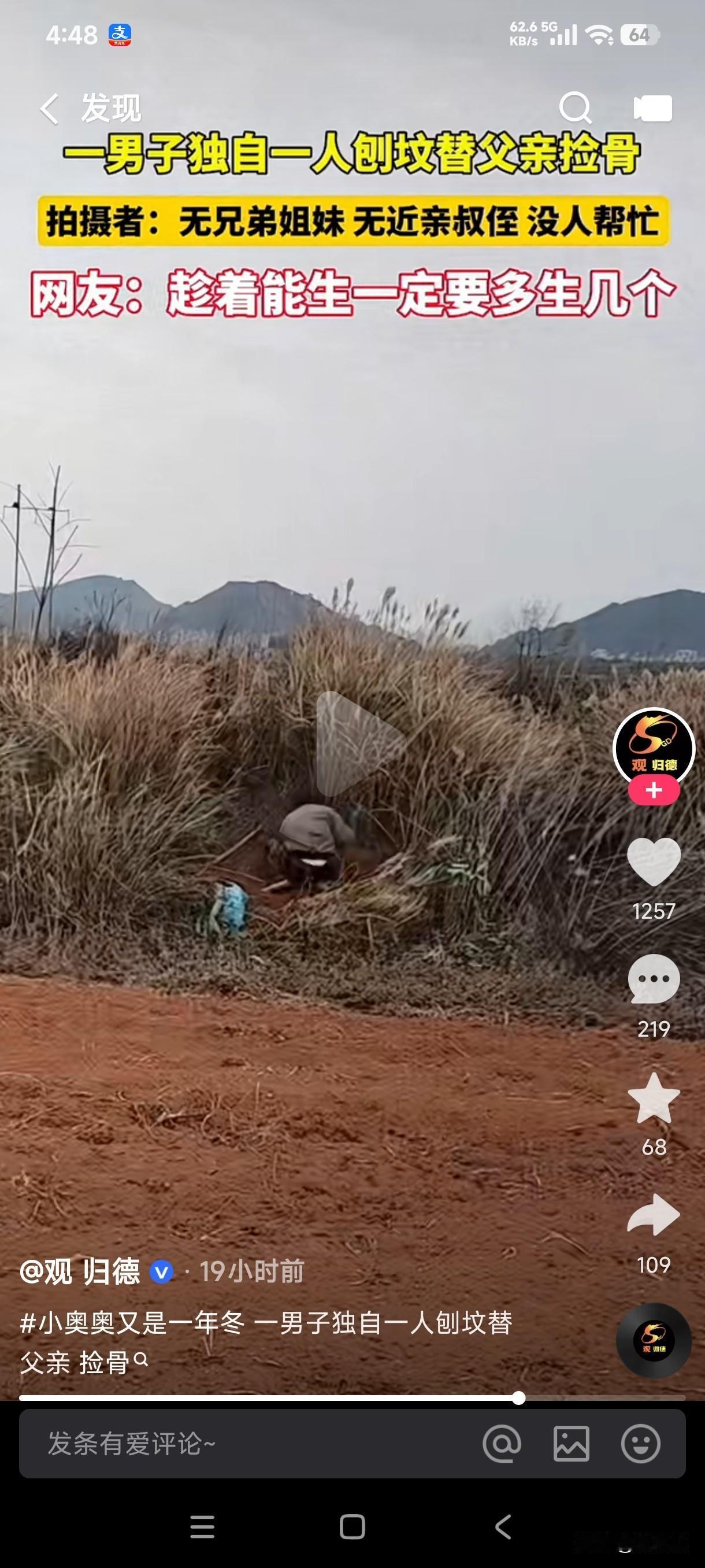 孩子多了肯定有多的好处不是吗? 男子独自一人刨坟替父亲捡骨,没有兄弟姐妹,也没有近亲叔侄帮忙。 这一幕让多少网友看的心酸落泪,对于有些地方的丧葬风俗来说,人死后过几年要重新选地方埋葬,就要刨坟捡骨在埋到别的地方,对于没有兄弟姐妹,没有近亲叔侄的人来说,这件事就要自己一个人去完成,连个帮忙的人都没有,这是不是太让人心酸了,甚至有网友说在能生的年纪一定要多生几个孩子,这就是百年以后父母都走了的底气,最起码孩子多了刨坟还有人帮忙不是吗?