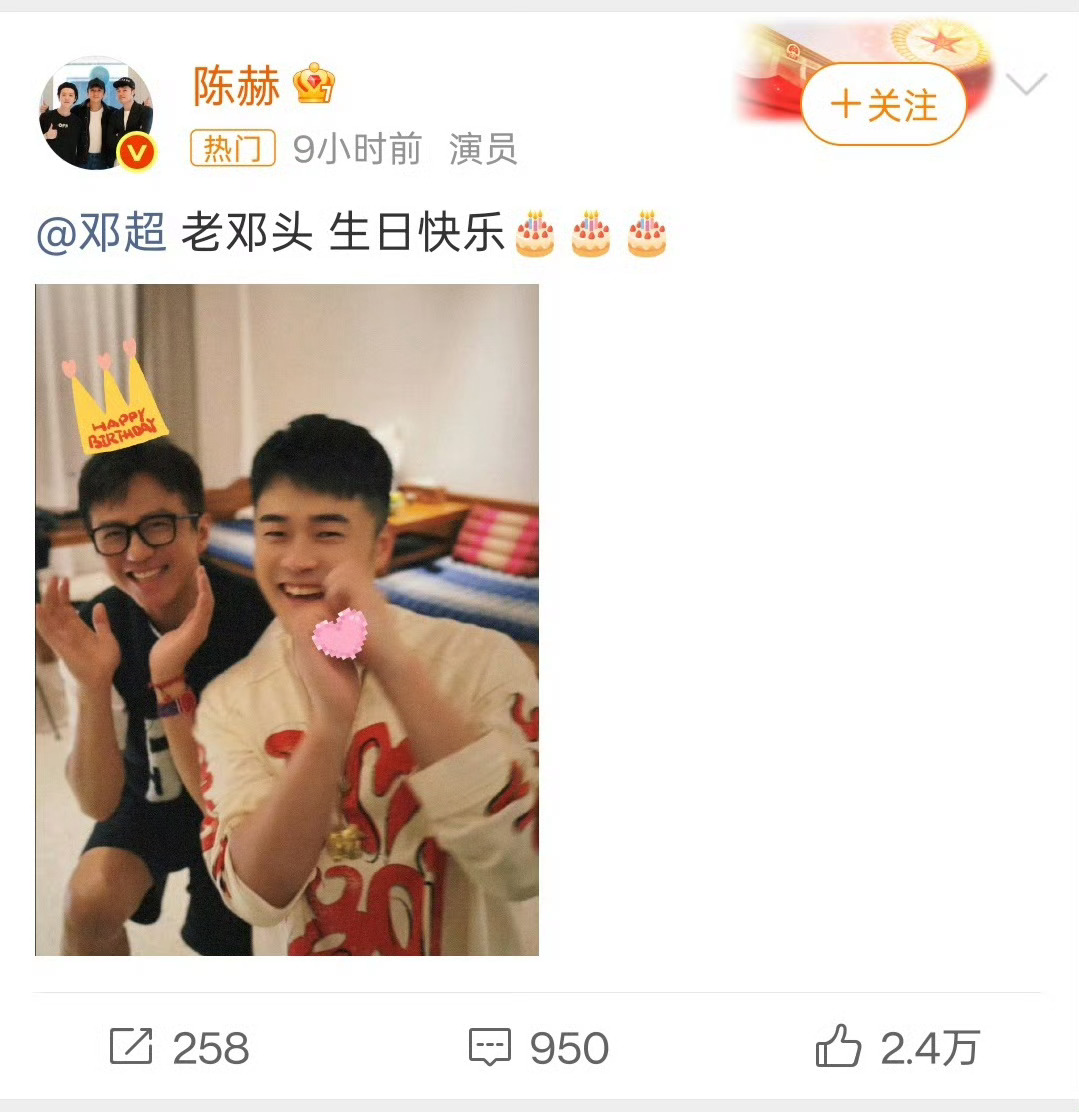 陈赫祝邓超生日快乐 记得超哥在胜券在握的采访里说,因为自己生日很靠近春节,所以已经很多年没庆祝过生日了。当时胜券在握的导演刘循子墨导演在片场给他庆生非常惊喜[抱抱你]今年就让我们在抖音,给一直带给我们快乐的超哥,一个开心的生日庆祝吧