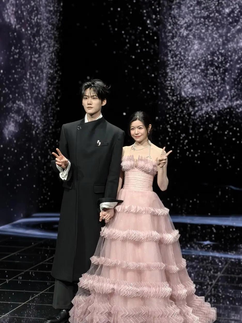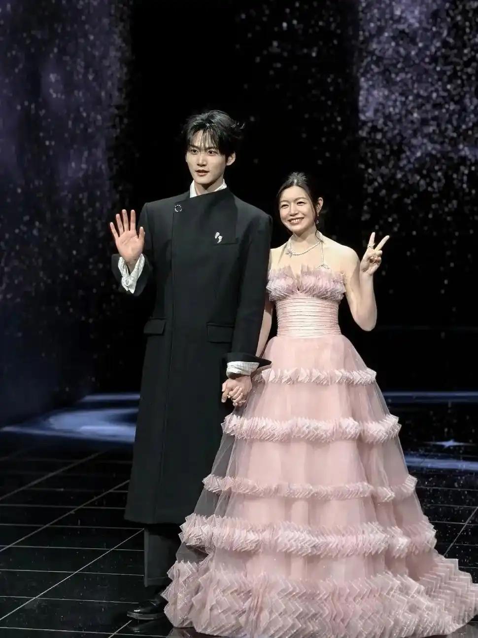 陈妍希与周柯宇以淡紫纱裙与黑色西装的深浅碰撞惊艳红毯,十指紧扣、默契比心的自然互