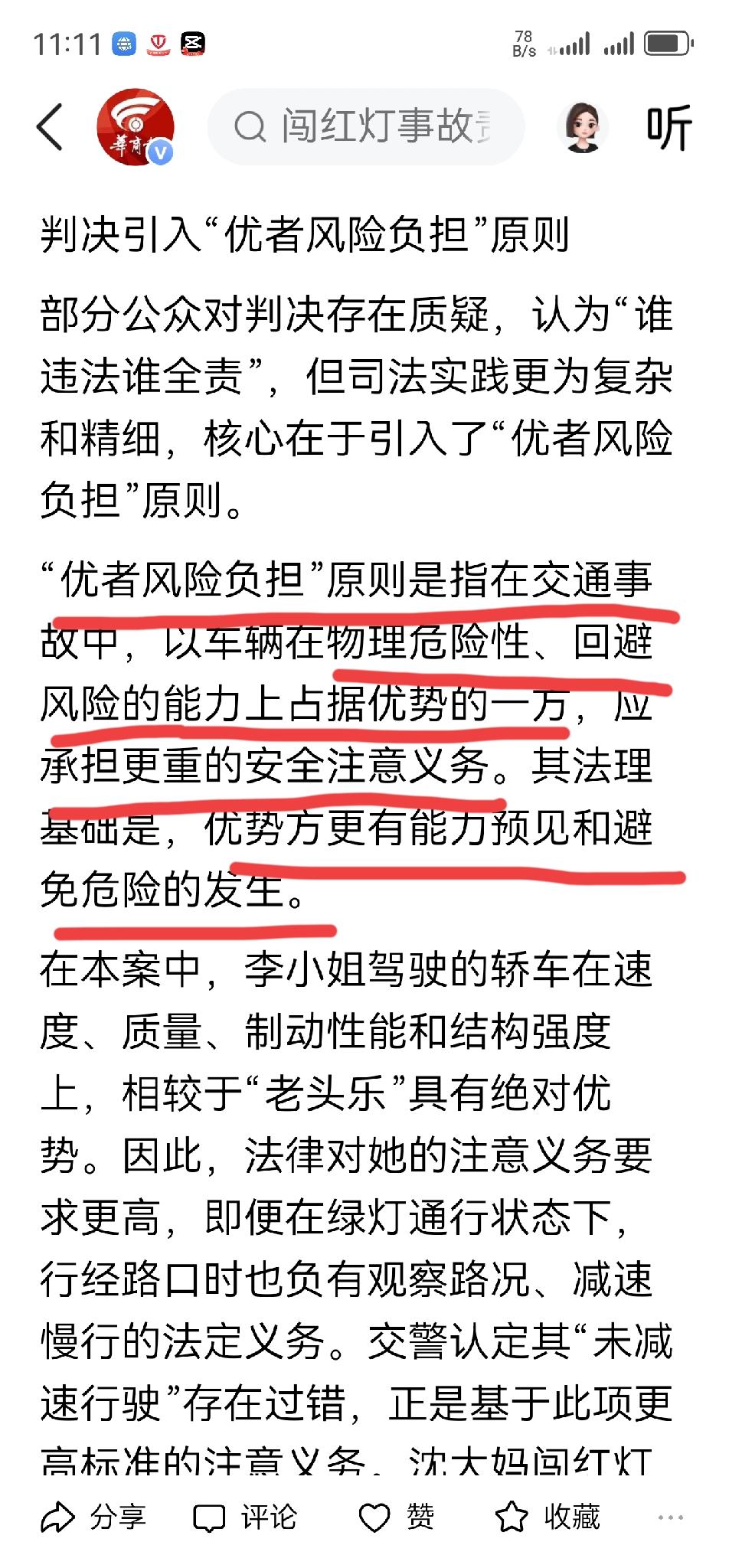 用优者风险负担原则让闯红灯老头乐获赔 36 万。 那一辆 6 万的机动车碰上闯红灯的一辆 5 万的机动车,是不是 6 万的机动车也要赔偿? 闹的沸沸扬扬的上海老头乐闯红灯被撞还获赔 36 万事件,之所以引发舆论关注,说到底,还是人们认为没有过错的一方不应该承担责任。 现在律师解释说,法院之所以这么判,是因为优者风险负担原则。 这一原则说白了,就是谁的车好,谁更应该负担风险。 你机动车制动刹车都比老头乐好,那么你负担风险。 那要是 6 万元的车和 5 万元的车比呢?车价贵一块是不是也是优者? 这样对比,抛开违法事实不谈,只谈谁车好谁车坏,那就没意思了!