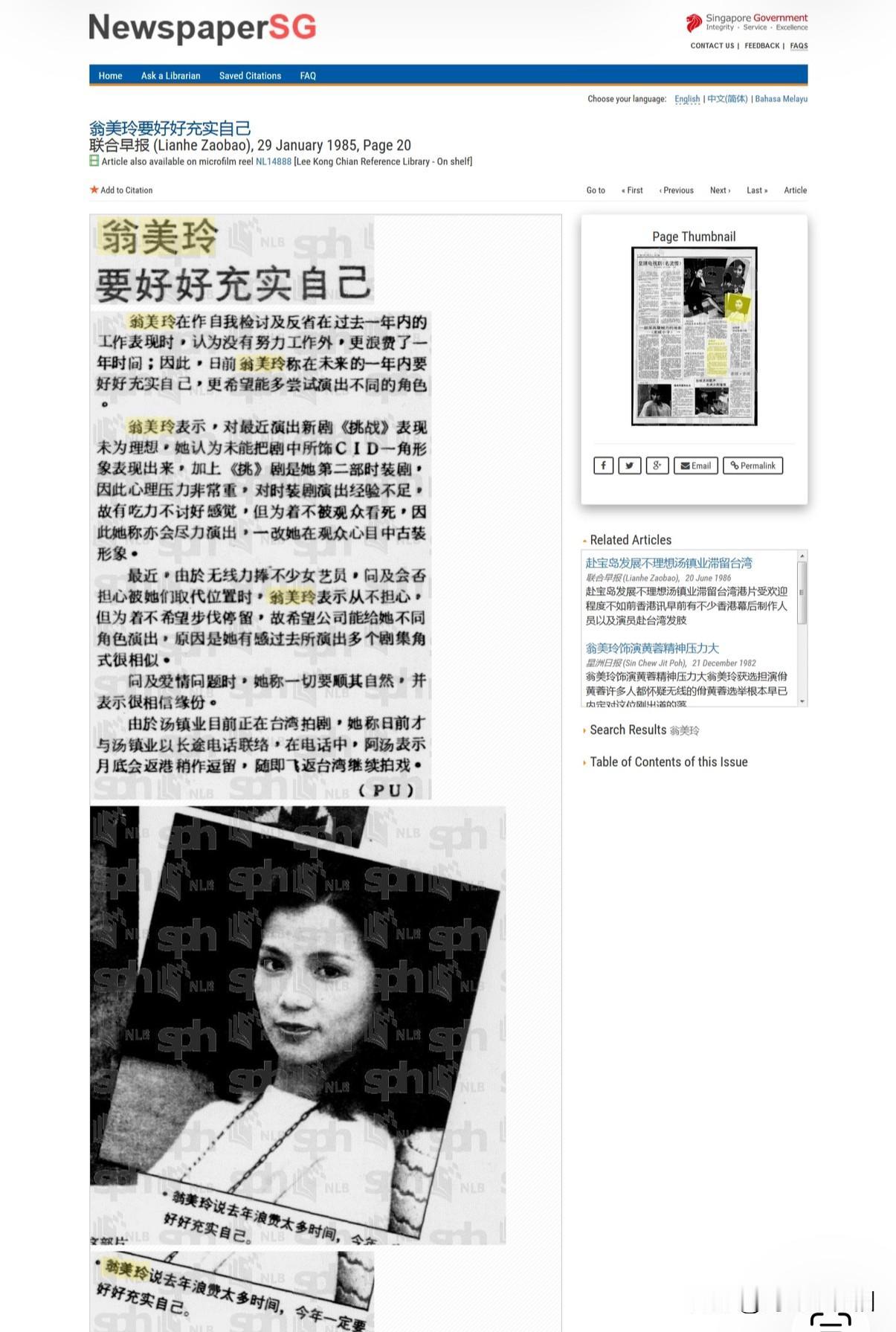 🎆翁美玲旧刊报道👉翻到一篇1985年的旧报道,原来那时的翁美玲就已经在认真规