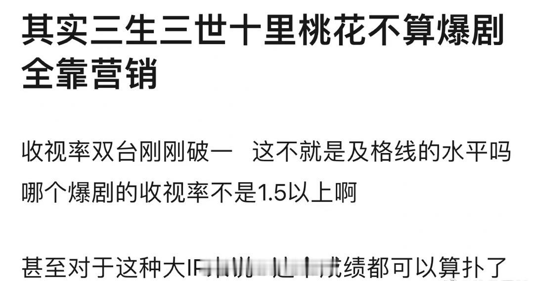 有网友觉得杨幂《三生三世十里桃花》不算爆剧,双台收视率刚破1,是及格线水平……这部剧云合集均3.9亿➕,至今无人超越。这还不叫爆剧