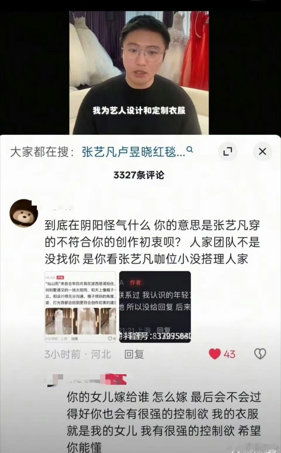 张艺凡微博之夜穿那个衣服热度超级高,设计师出来说张艺凡没经过他同意穿了衣服他本人回复说张艺凡之前联系过他,但他不太了解张艺凡就没借给她,之后张艺凡团队去找了合作商。结果现在这个衣服被张艺凡穿火了他现在又跑出来说张艺凡没经过他同意了