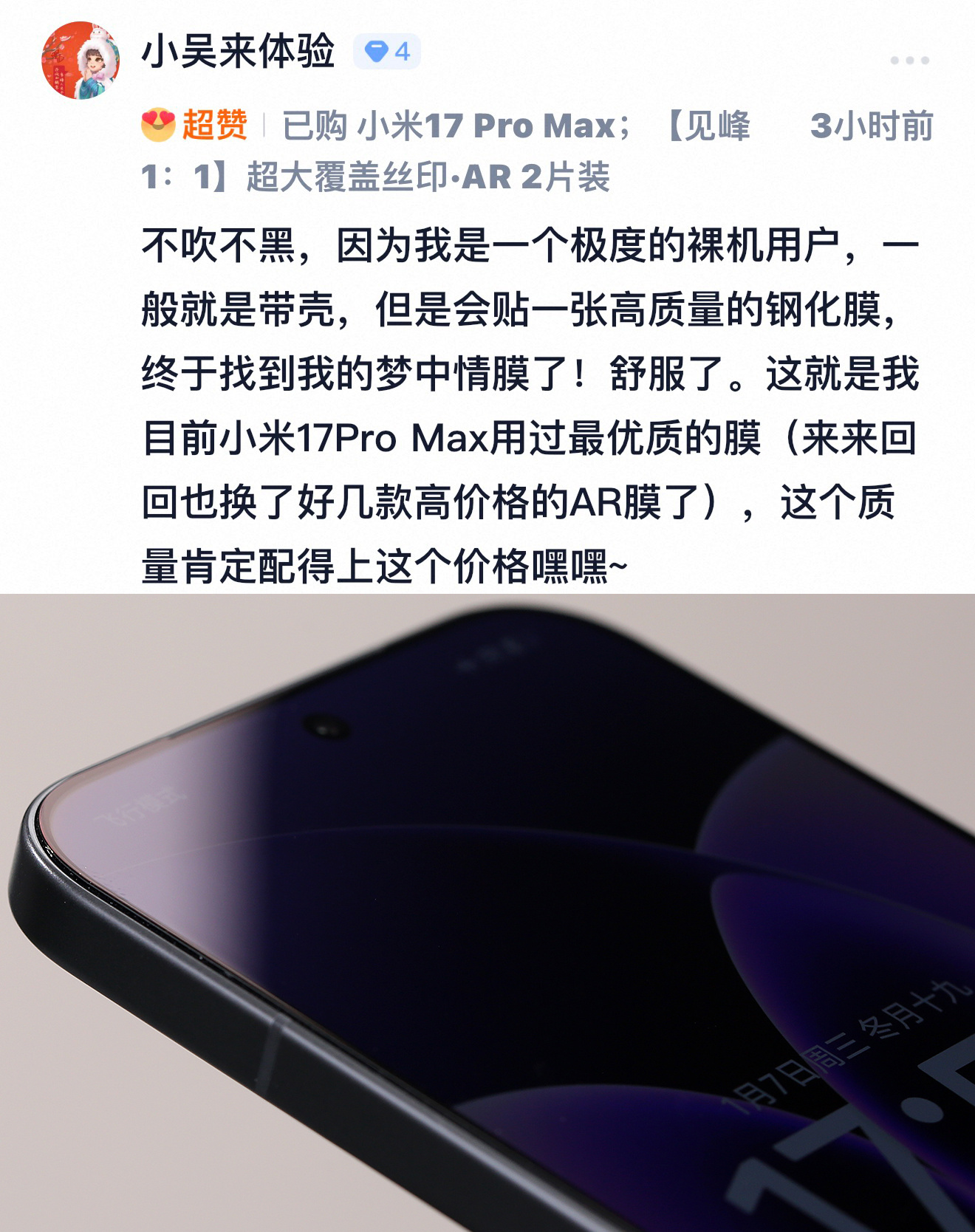 小米 17 系列见峰 1:1 AR 膜超超超大覆盖,前置无开孔,丝印黑边沉浸一体感十足。边缘 2.5D 弧度设计,即使裸机使用,手势操作依旧顺滑舒服