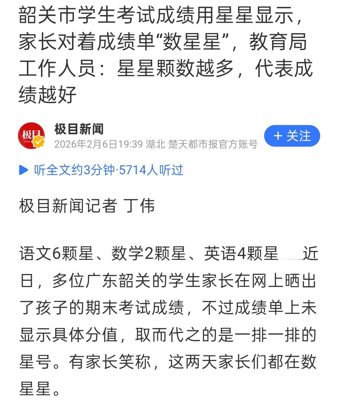 让家长通过数星星的方式了解孩子的学习成绩,只是一个成人并不喜欢的无聊游戏。 把衡量学生学习成绩高低的考试分数变成小星星,不会从根本上减少家长的教育焦虑。 近日,多位广东韶关的学生家长发现,孩子的各科期末考试成绩不是具体的考试分数,而是一排一排的小星星。 这些小星星从何而来?其实,这并是一种抽象的评价,这些小星星都是根据考试成绩折算而来。 只不过,星星的个数不像分数那样具体,孩子的成绩被弱化成等级。比如,原来91分和99分的差距一目了然,但现在都是10颗星。 问题是家长仍然关心的是孩子成绩,是考试的具体分数,这样更能掌握或了解孩子的真实学习状况,数星星有难免有自欺欺人之嫌。 况且,在现实世界里,不管是中考还是高考,也不管是考研还是考公,最终还是以分数高低论英雄,“星星”并不流行。 所以,学校的教育创新还是应该符合当下的社会背景,为了创新而创新,没有价值也没有意义。 把孩子的考试成绩折算成小星星展现给家长看,当做游戏玩玩就好,别太当真就好。小星星再多,也缓解不了家长的焦虑。
