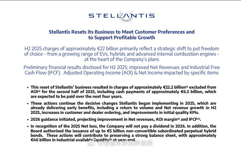 Stellantis集团因电动车业务收缩计提1800亿损失,单日股价暴跌近30%。公司将暂停股息并融资,终止电池项目、削减车型并裁员,承认高估电动化转型速度。欧洲需求疲软及中国产业链成本优势加剧其困境,全球份额受冲击。