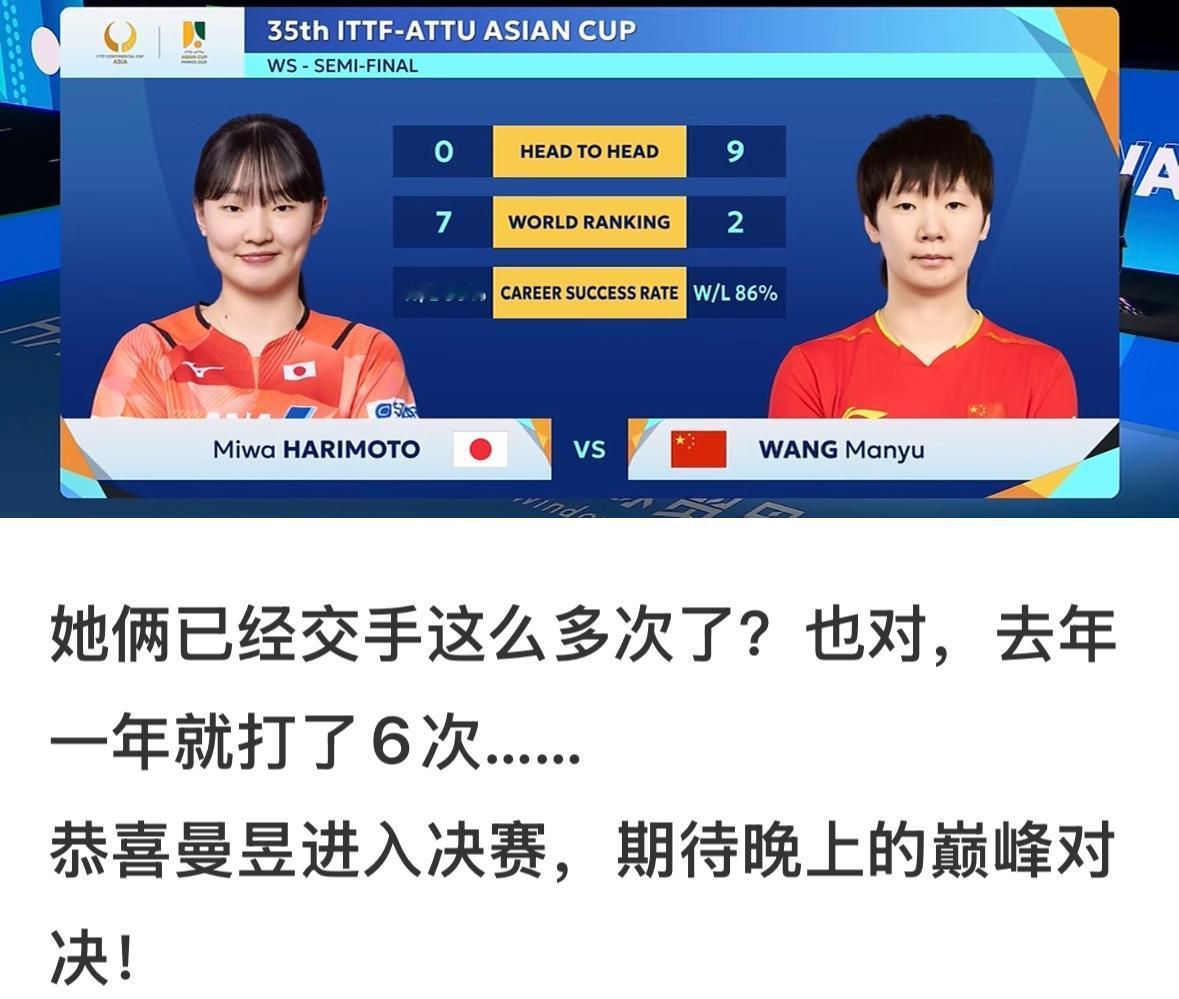 恭喜王曼昱4:2张本美和晋级亚洲杯女单决赛——张本美和友哭啦! 2月8日,海口亚洲杯女单半决赛, 王曼昱在先丢一局的情况下, 力挽狂澜, 4:2拿下张本美和! 这是曼昱第十次击败张本美和, 7:11,11:3,14:12,8:11,11:8 11:8, 这是张本美和打的最精彩的一场球, 每一个球都非常合理, 都在调动曼昱两边的大角, 太艰难的一场比赛, 有惊无险的比赛, 但我真的要窒息了的感觉, 尽管张本美和的技战术合理有效, 平时尽研究王曼昱和莎莎了, 但仍然无法战胜曼昱, 张本美和最后无奈的留下眼泪🥲…… 恭喜曼昱晋级决赛, 会师莎莎,国乒提前包揽冠亚军!
