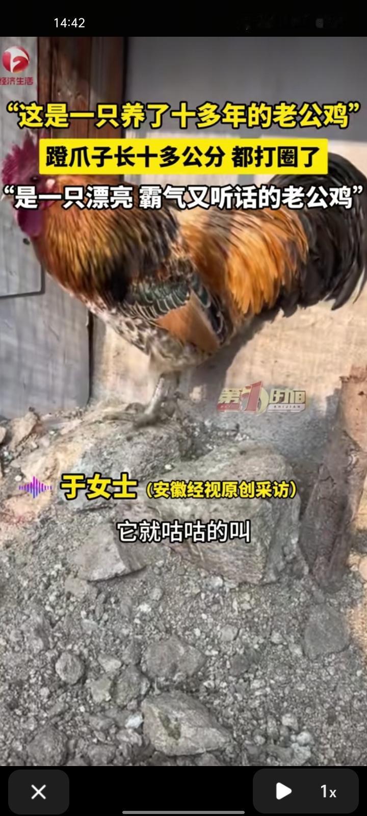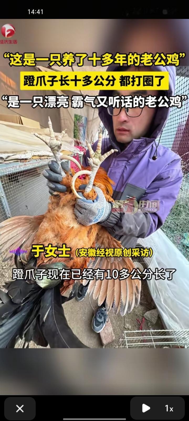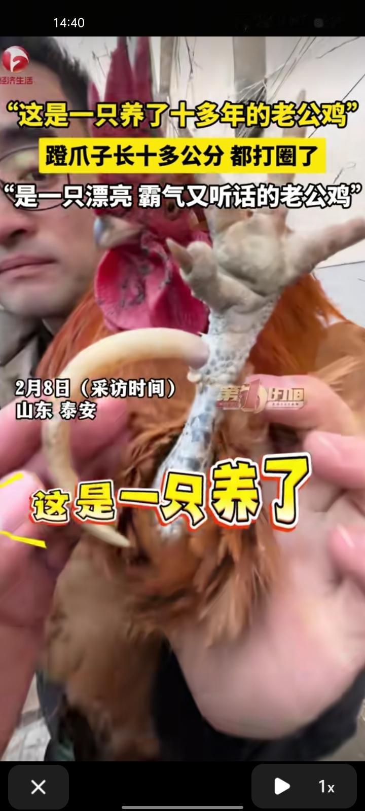 2月7日,泰安新泰市。男子展示养了十多年的公鸡,蹬爪子长十多公分,都打圈了,是一只漂亮、又霸气的老公鸡,逗它玩或者让它打鸣,它就咕咕叫。老公鸡年岁长了有招财辟邪之说,也可以看家护院。