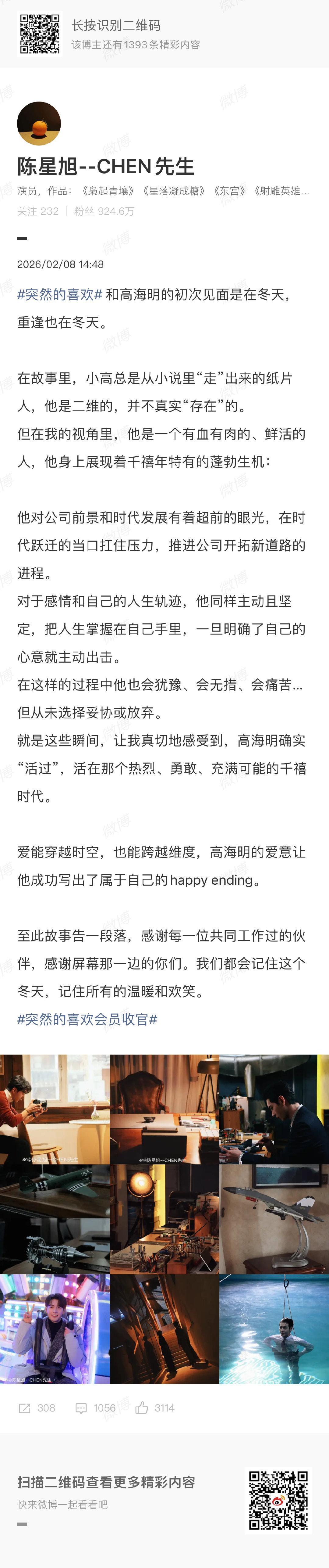 陈星旭突然的喜欢收官文陈星旭发文告别高海明至此故事告一段落,感谢每一位共同工作过的伙伴,感谢屏幕那一边的你们。我们都会记住这个冬天,记住所有的温暖和欢笑。